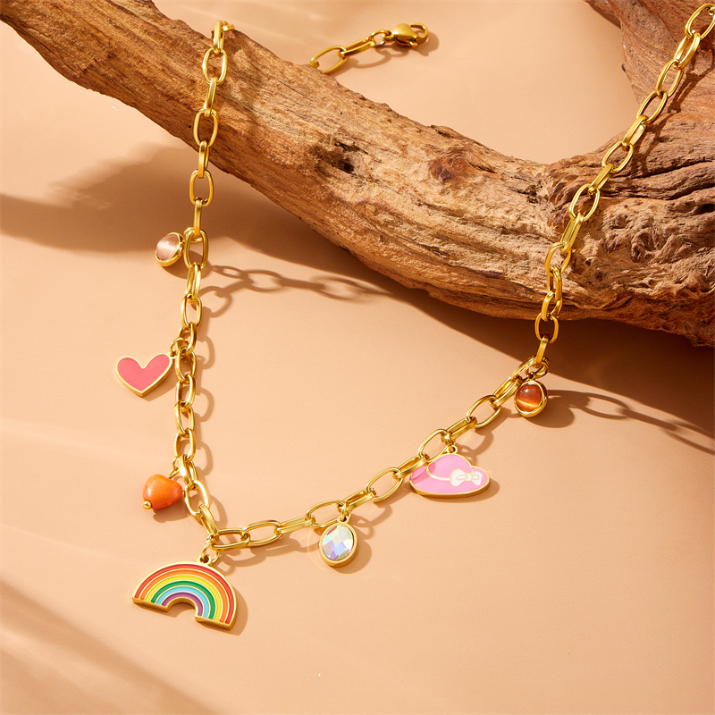 Fashionable cartoon sweet girl simple colorful drip heart rainbow hat pendant chain stainless steel sweatshirt necklace