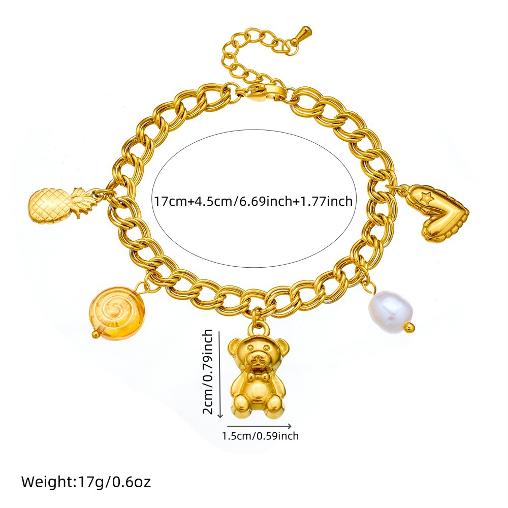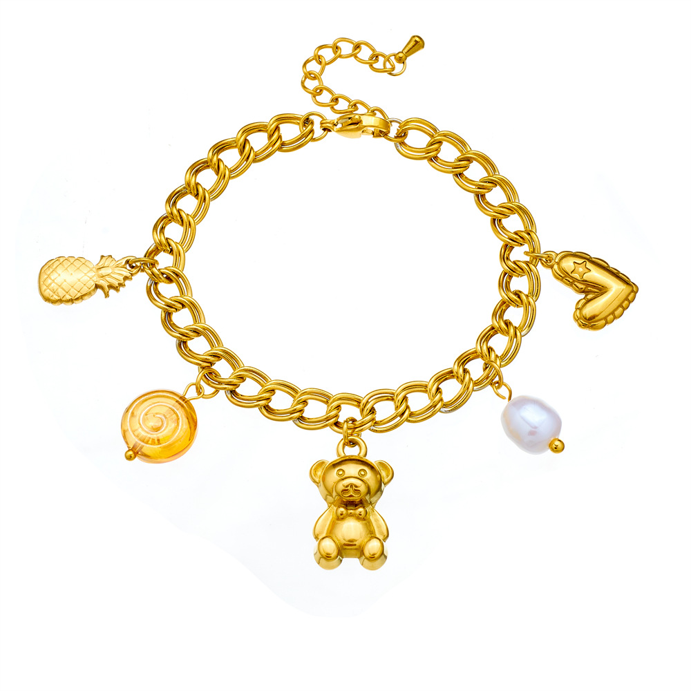 Fashionable double-chain gold-plated stainless steel heart pineapple bear pendant pearl jewelry bracelet
