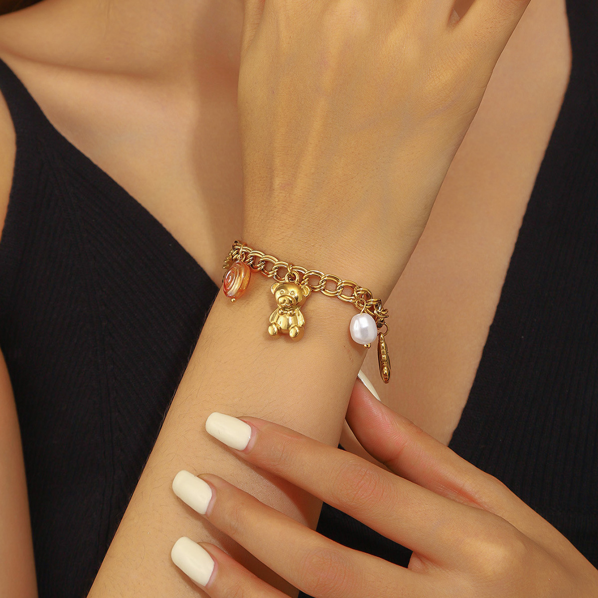 Home > New Arrival > Fashionable double-chain gold-plated stainless steel heart pineapple bear pendant pearl jewelry bracelet