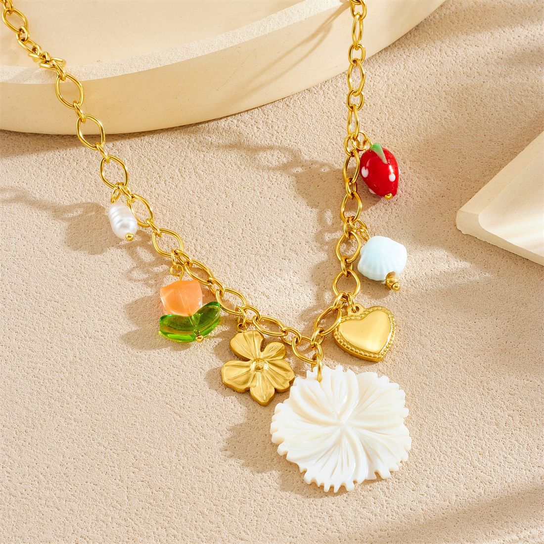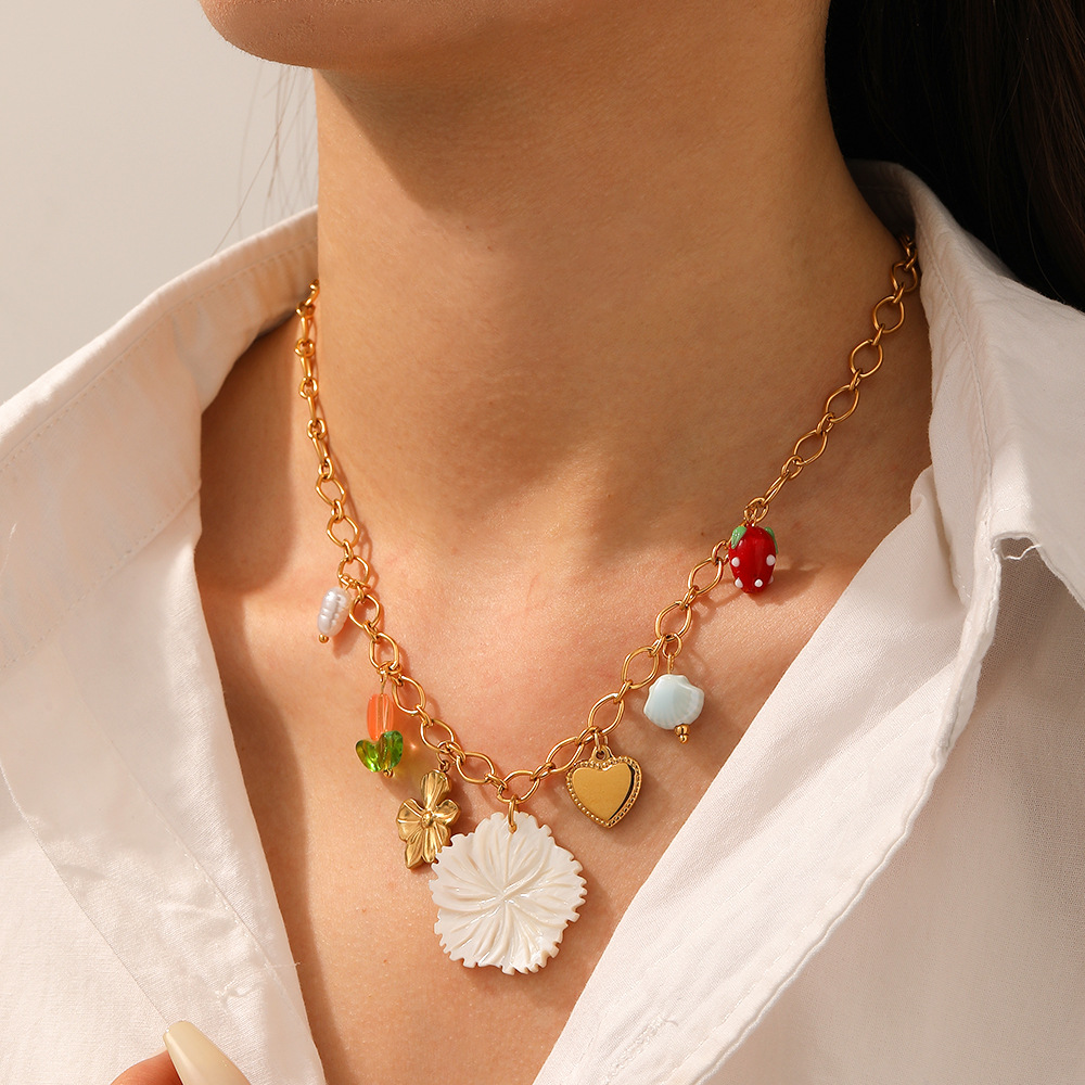 Home > New Arrival > Fashionable gold-plated heart and strawberry pendant necklace for women, creative and unique multi-element stainless steel clavicle chain.