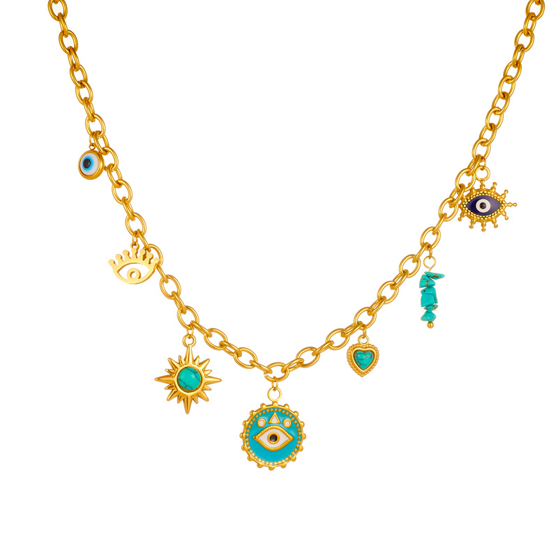 Home > New Arrival > Fashionable retr blue turquoise heart sun star drop eye pendant chain stainless steel necklace