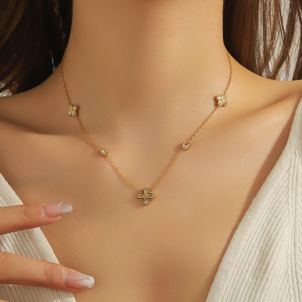 French retro-chic, light luxury, high-end diamond-encrusted teardrop-shaped four-petal flower pendant chain stainless steel clavicle necklace