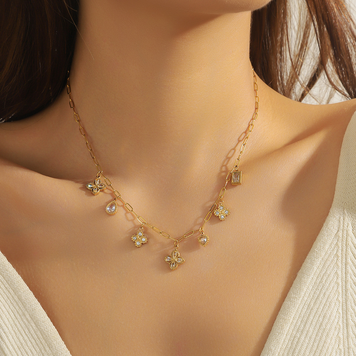 Home > New Arrival > French retro-chic, light luxury, high-end diamond-encrusted teardrop-shaped four-petal flower pendant chain stainless steel clavicle necklace