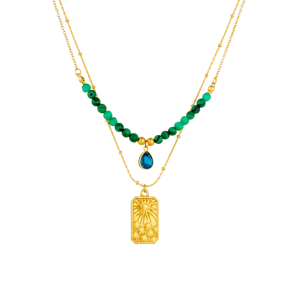French-style niche, artistic, retro malachite beaded emerald geometric square pendant, double-layered heart necklace