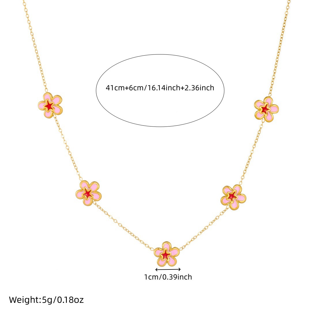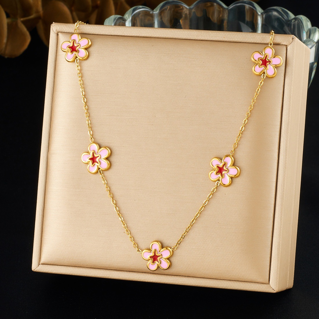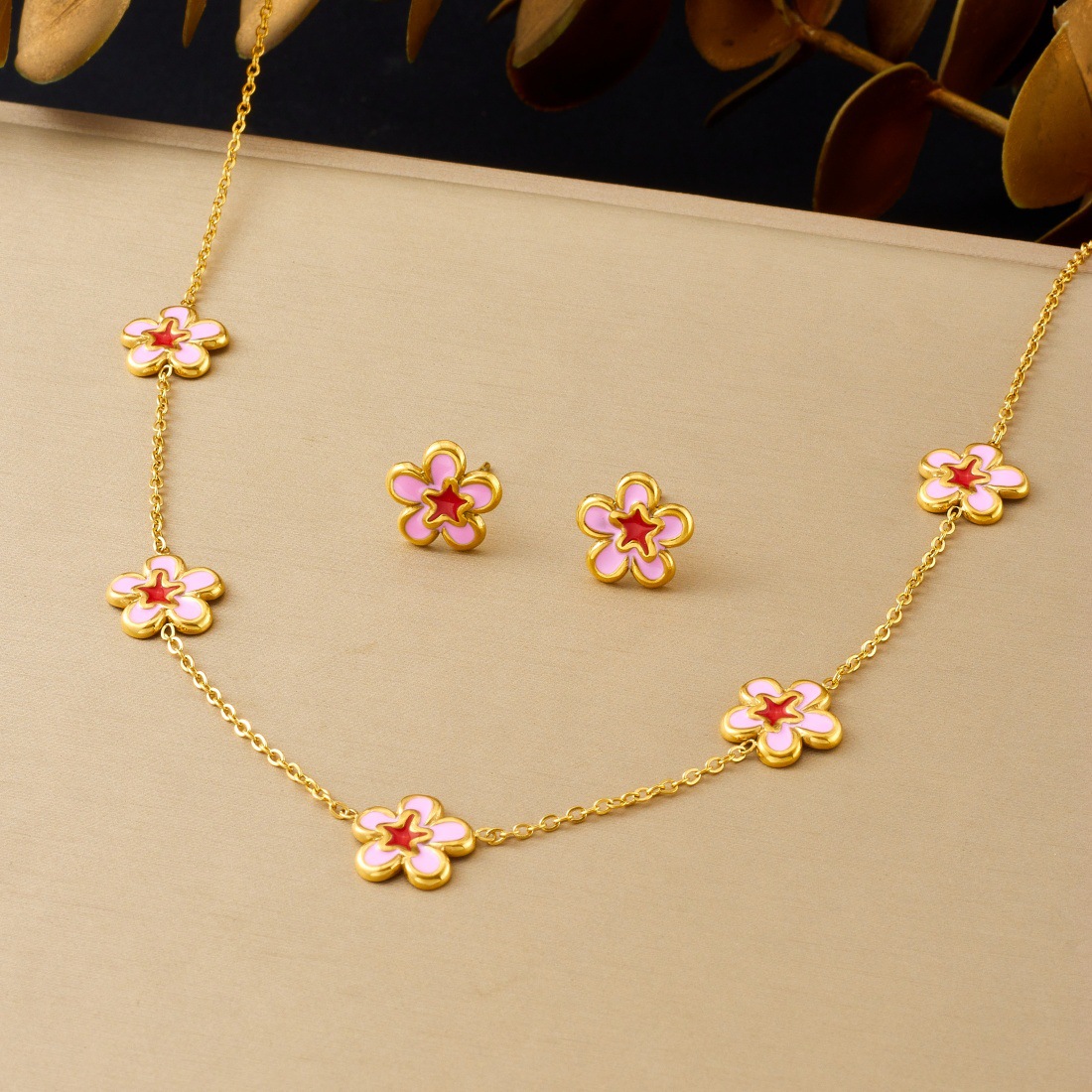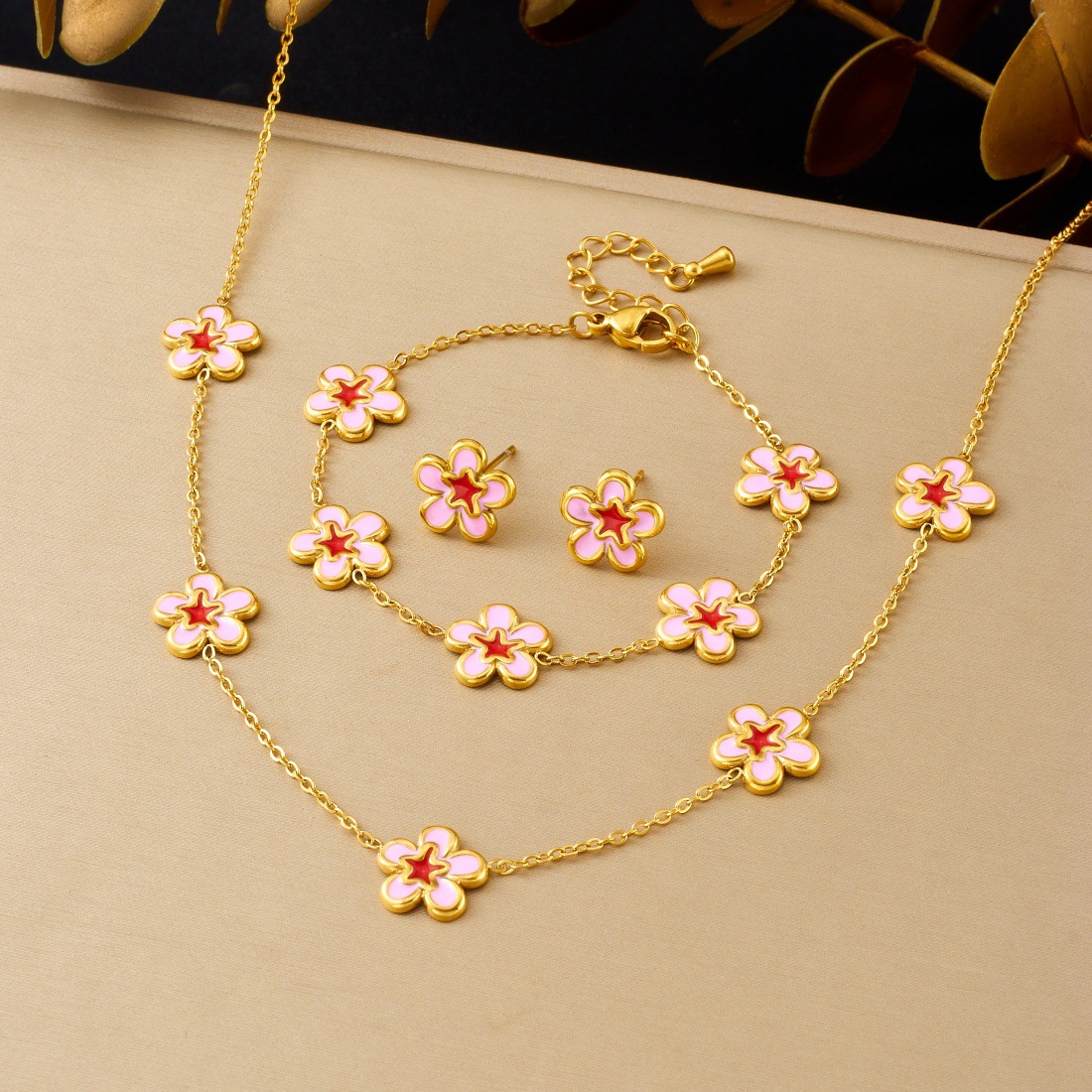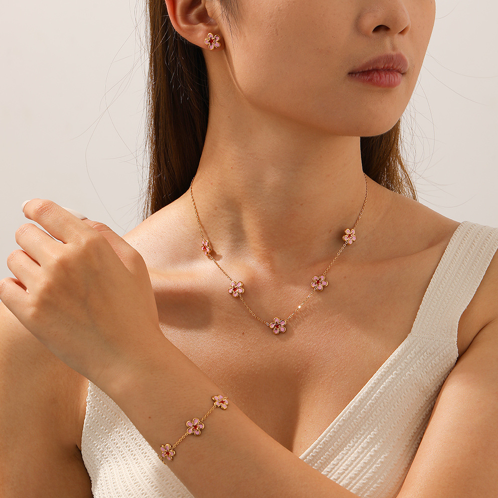 Fresh and sweet pink floral jewelry set with gold-plated peach blossom accessories and clavicle chain.