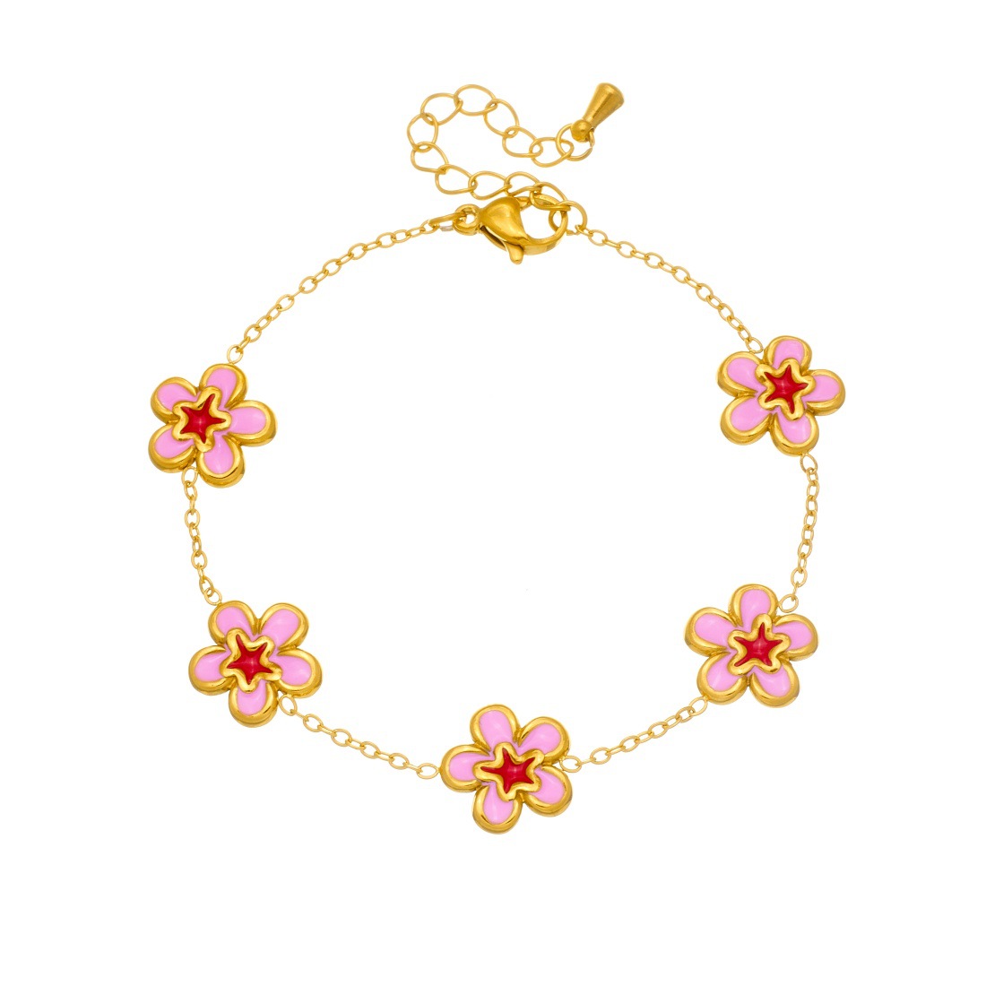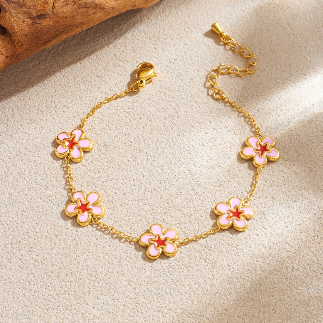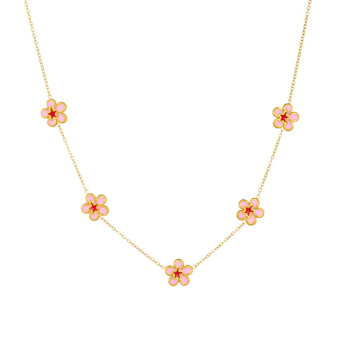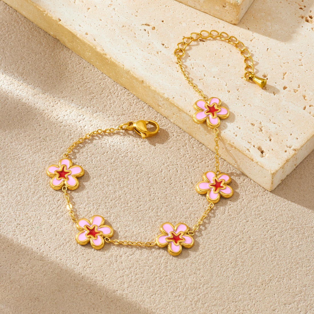 Fresh and sweet pink floral jewelry set with gold-plated peach blossom accessories and clavicle chain.