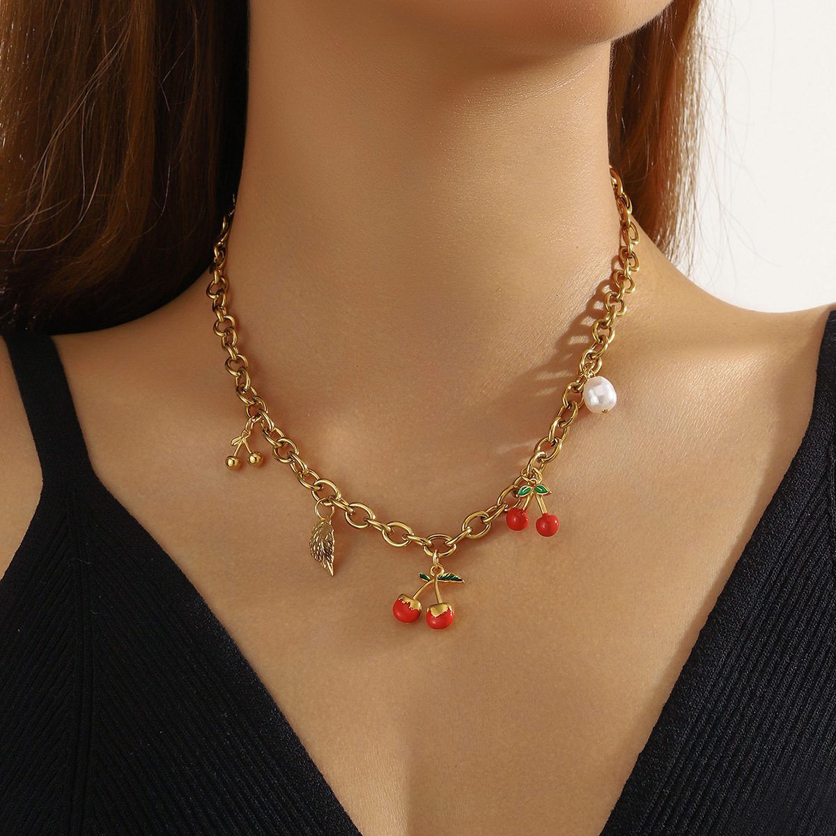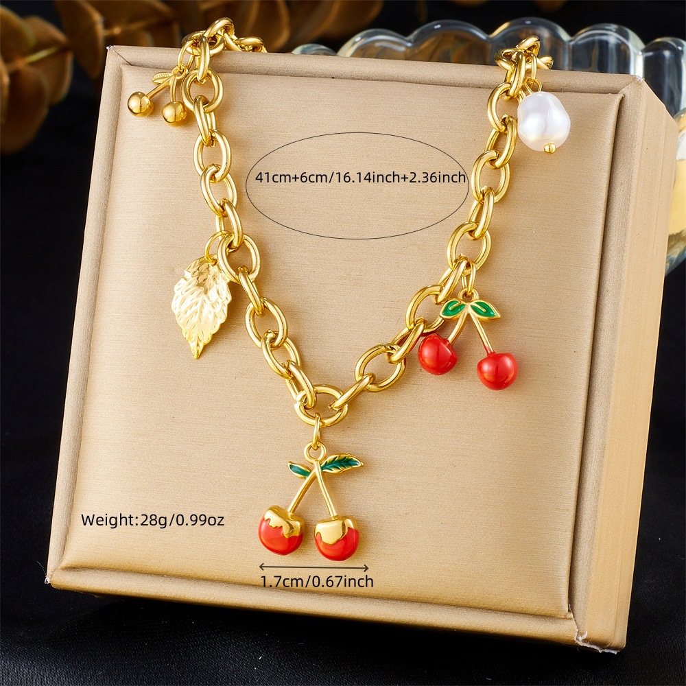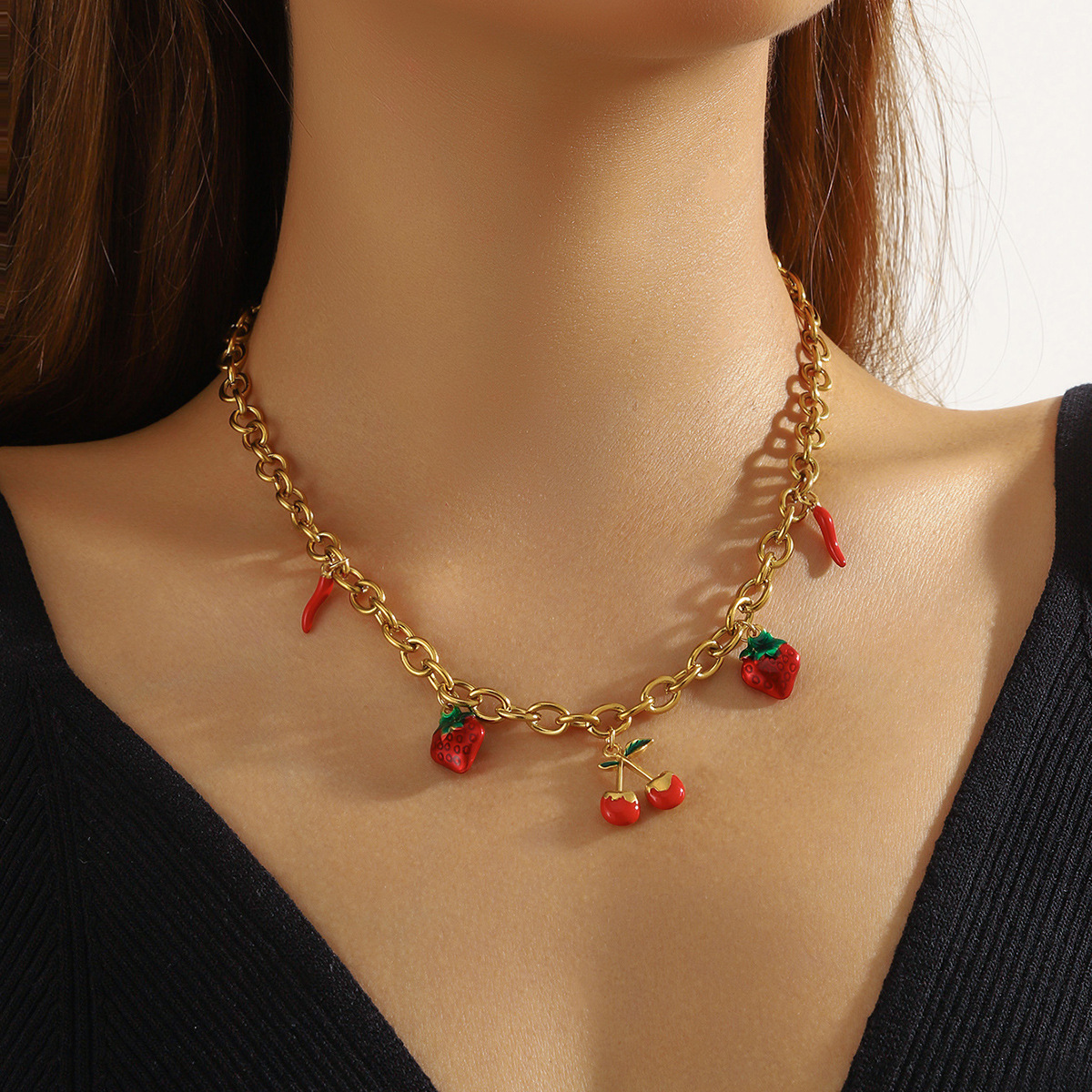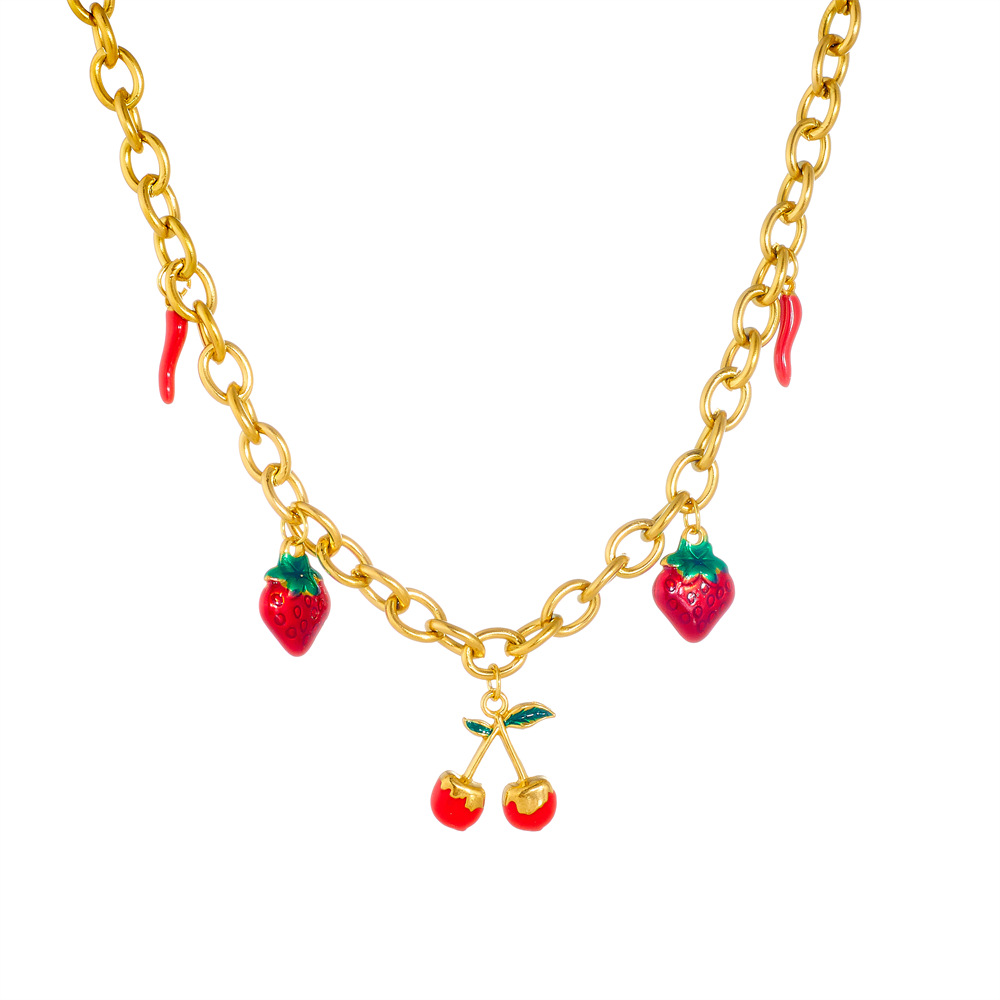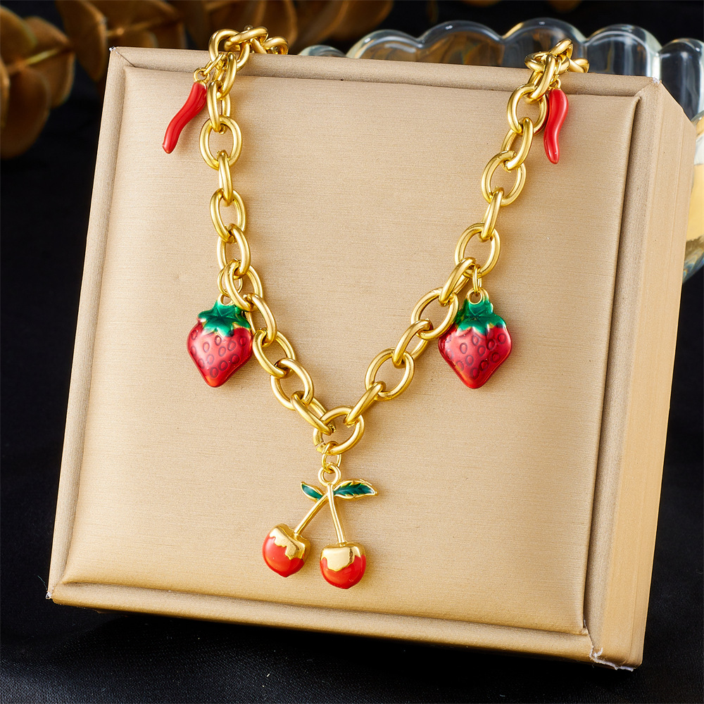 Home > New Arrival > High-end multi-element pendant with dripping strawberry and cherry fruit accessories stainless steel chain necklace