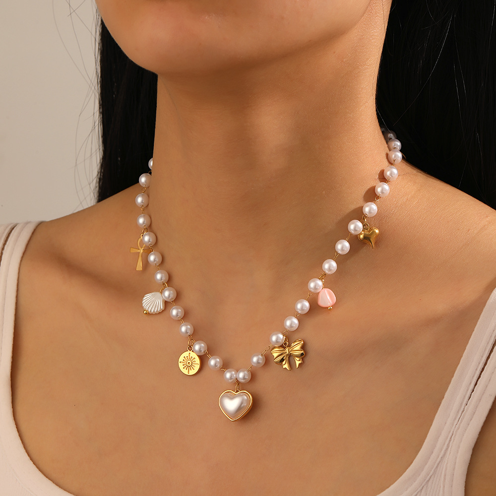 Home > New Arrival > Korean Dongdaemun imitation pearl chain scallop heart bow star pendant stainless steel accessory necklace