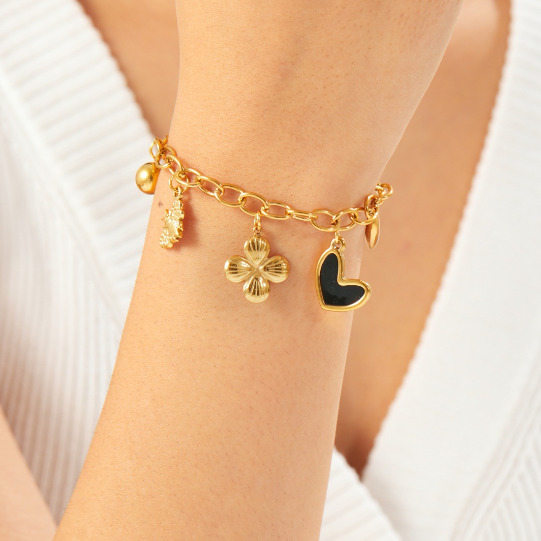 Korean style, fashionable and simple, gold-plated black dripping heart and flower pendant, stainless steel chain, versatile jewelry bracelet.