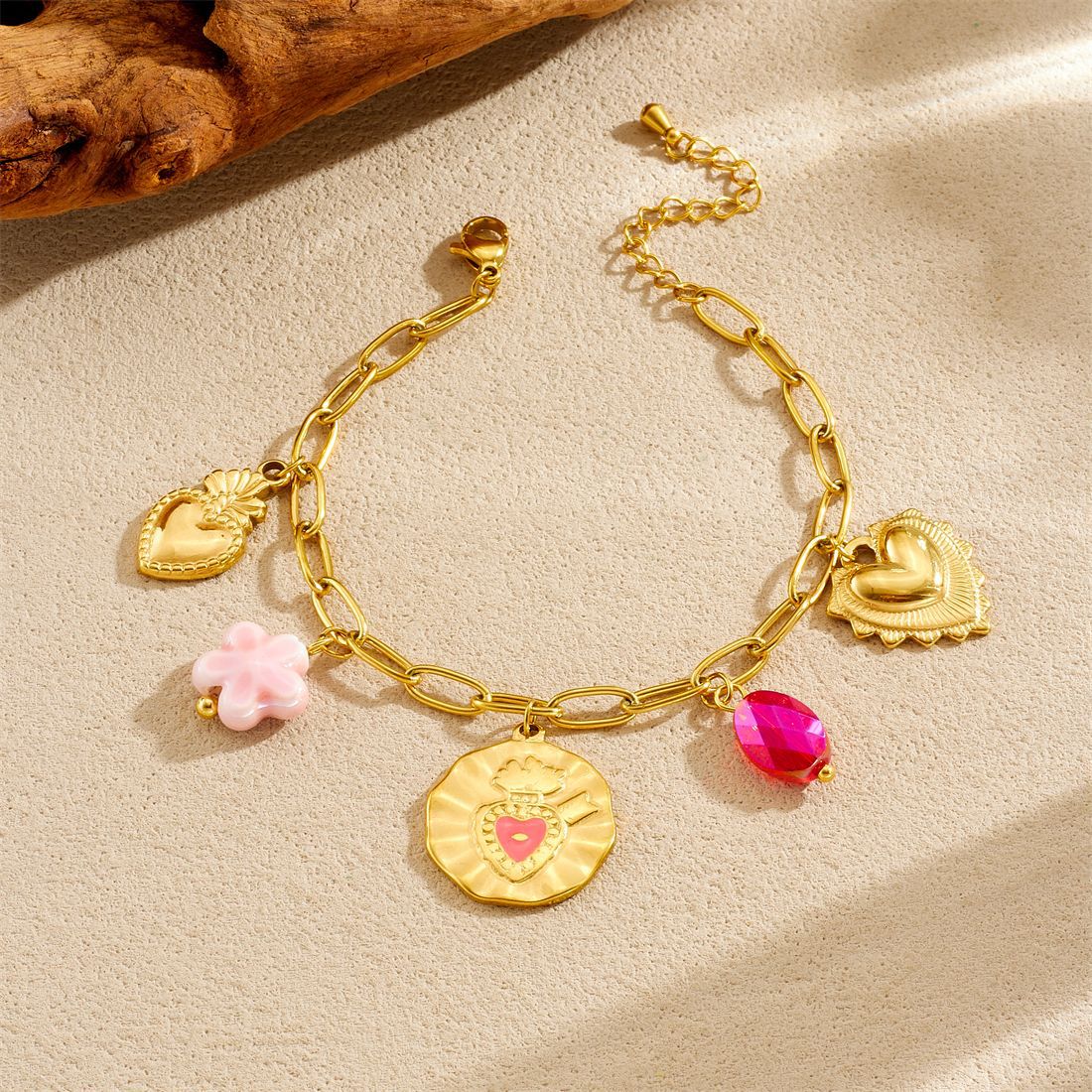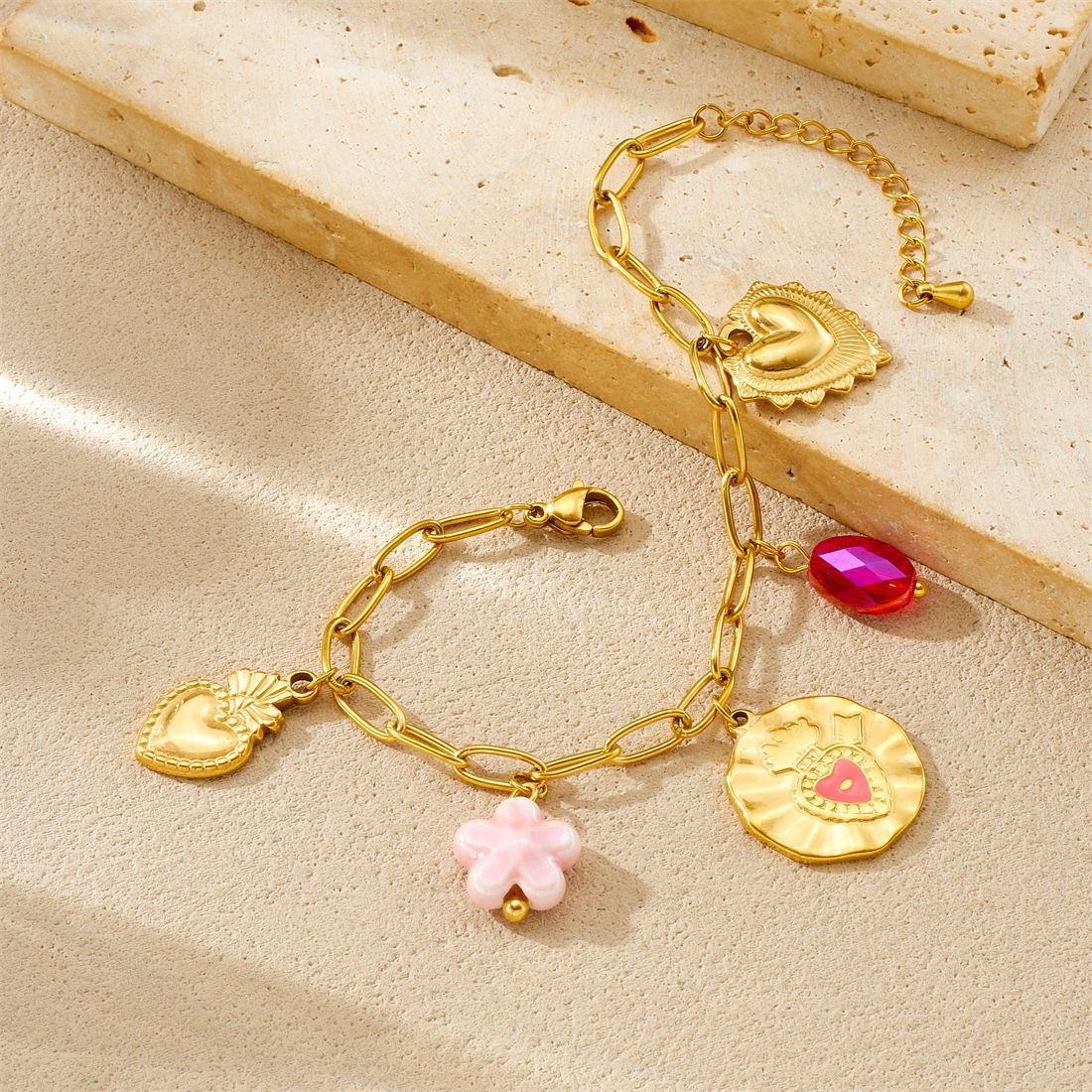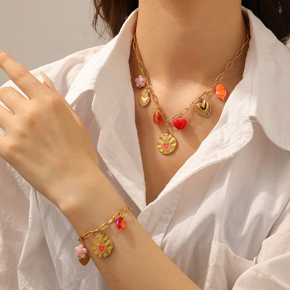 Korean-style fashionable Instagram-inspired multi-element gold-plated round pendant with irregular dripping heart and flower design, stainless steel set.