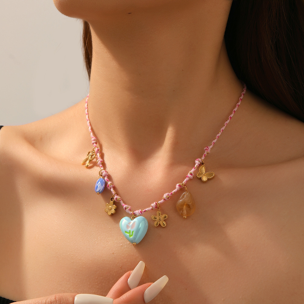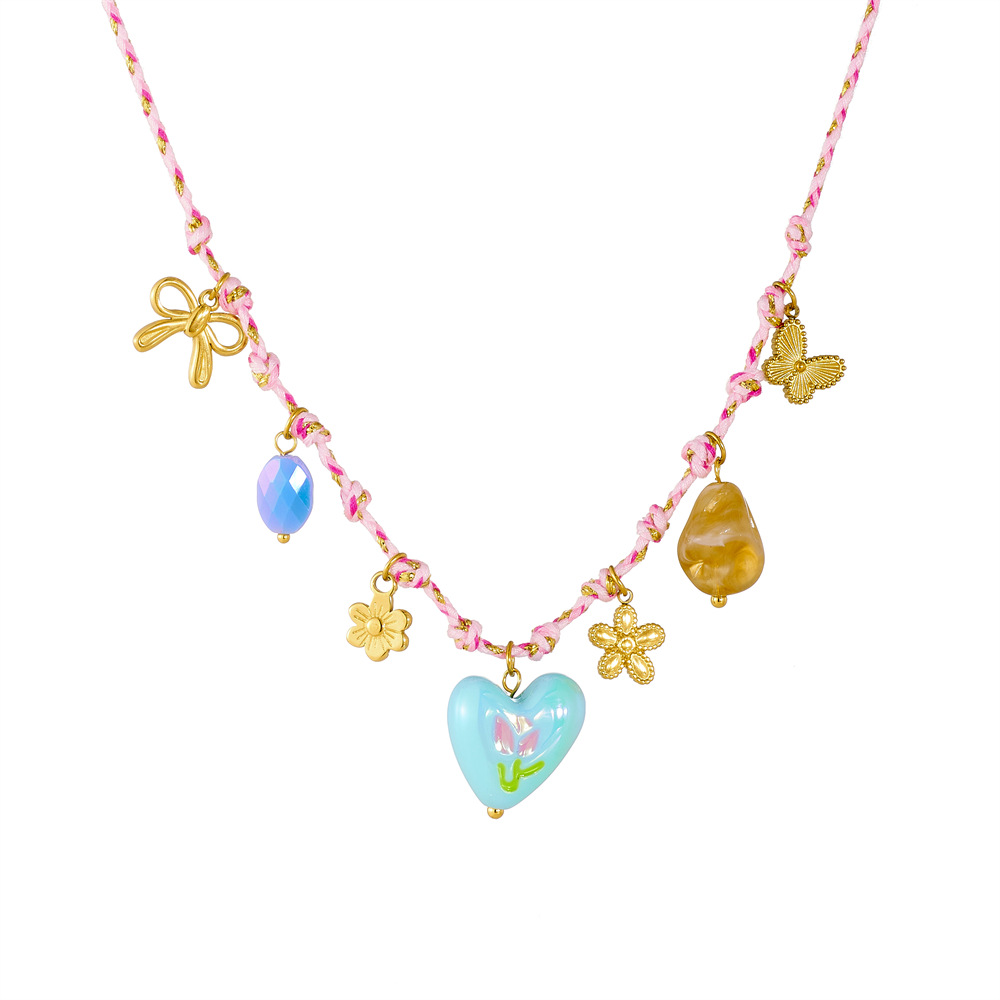 Home > New Arrival > Korean style new creative fashion color-blocked woven rope knotted stainless steel flower sun heart drip print necklace