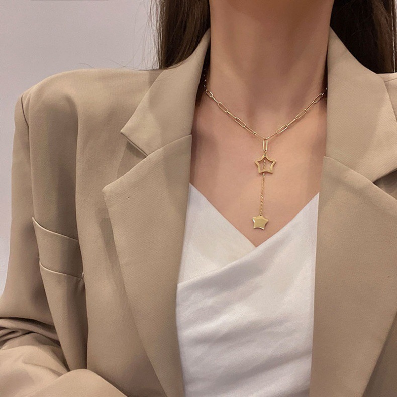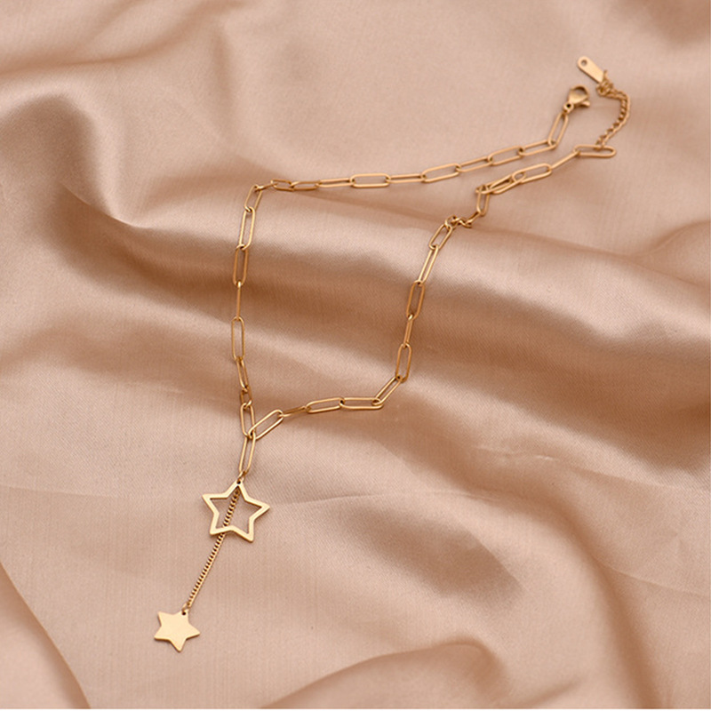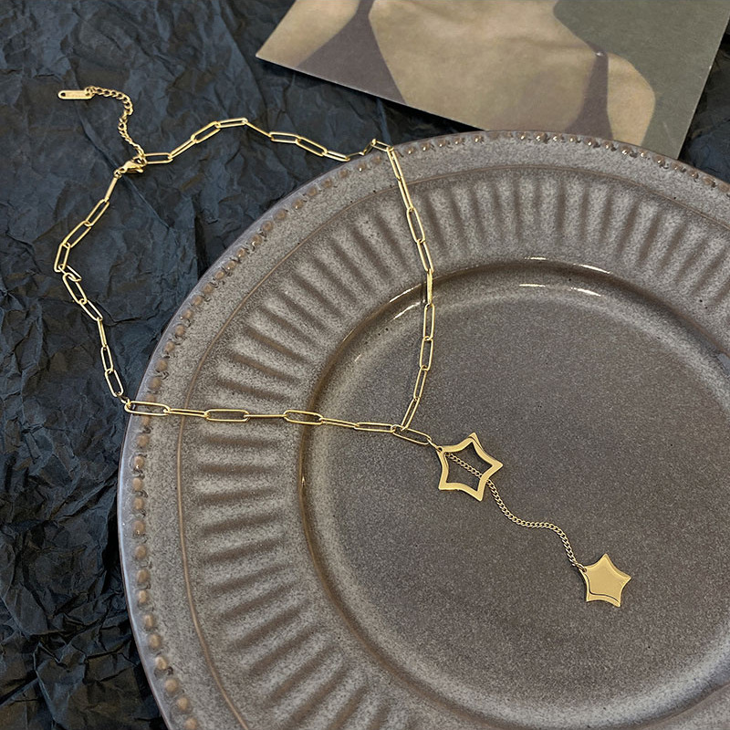 Home > New Arrival > Minimalist and elegant hollowed-out five-pointed star tassel pendant titanium steel necklace, fashionable and versatile, unique clavicle chain.
