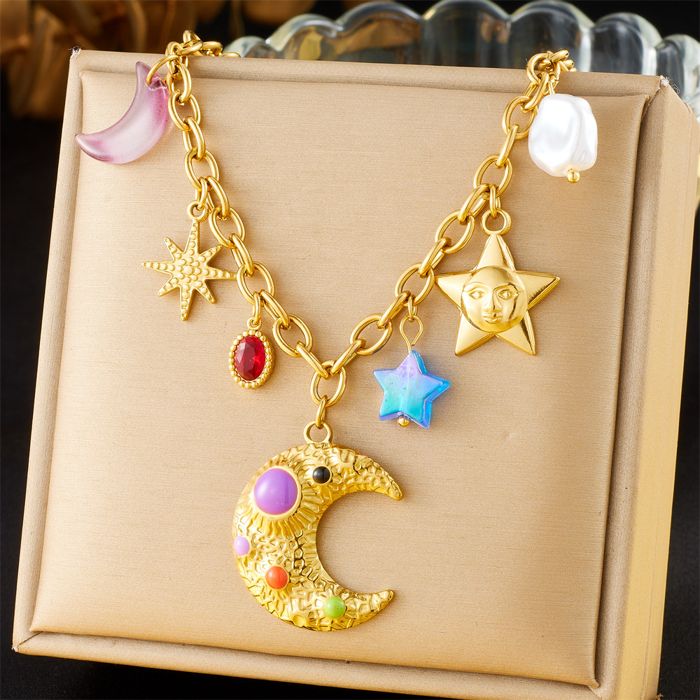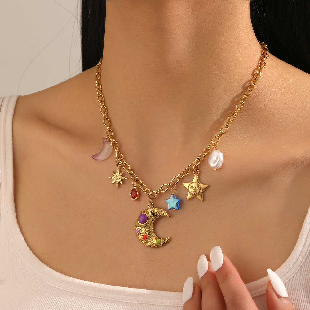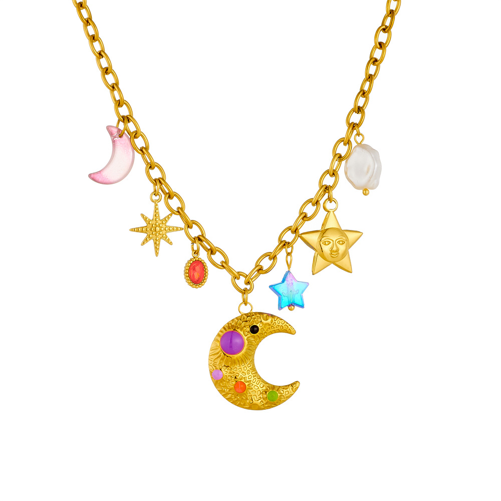 New fashion personalized colorful moon and star gold-plated accessories chain stainless steel multi-element pendant necklace