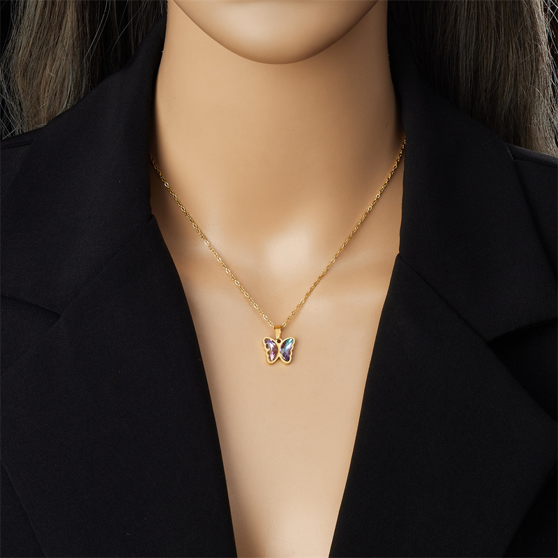 Home > New Arrival > New fashion sweet gradient butterfly rhinestone pendant stainless steel jewelry set necklace and earrings