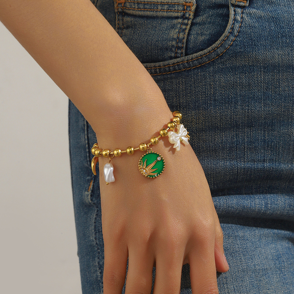 New gold-plated drip round pendant sun moon bow pearl chain stainless steel bracelet
