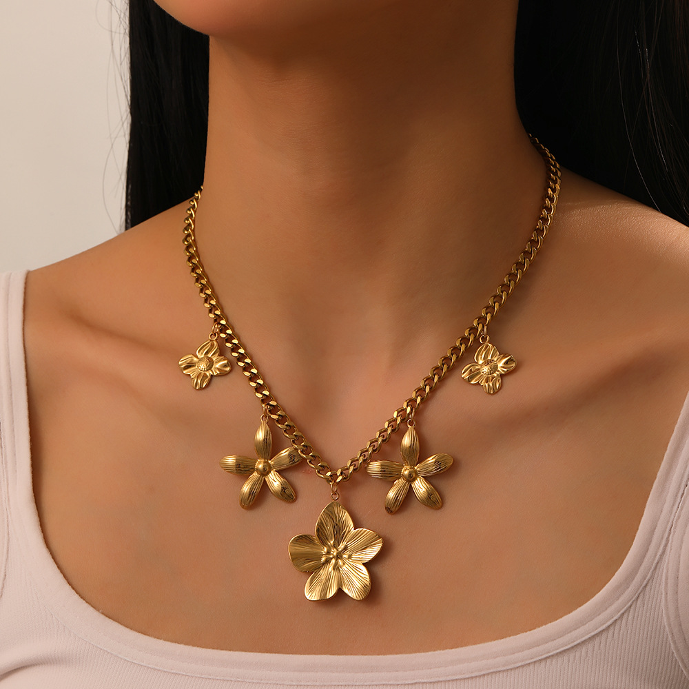 New light luxury and elegant gold-plated stainless steel five-petal flower pendant chunky chain clavicle necklace for women.