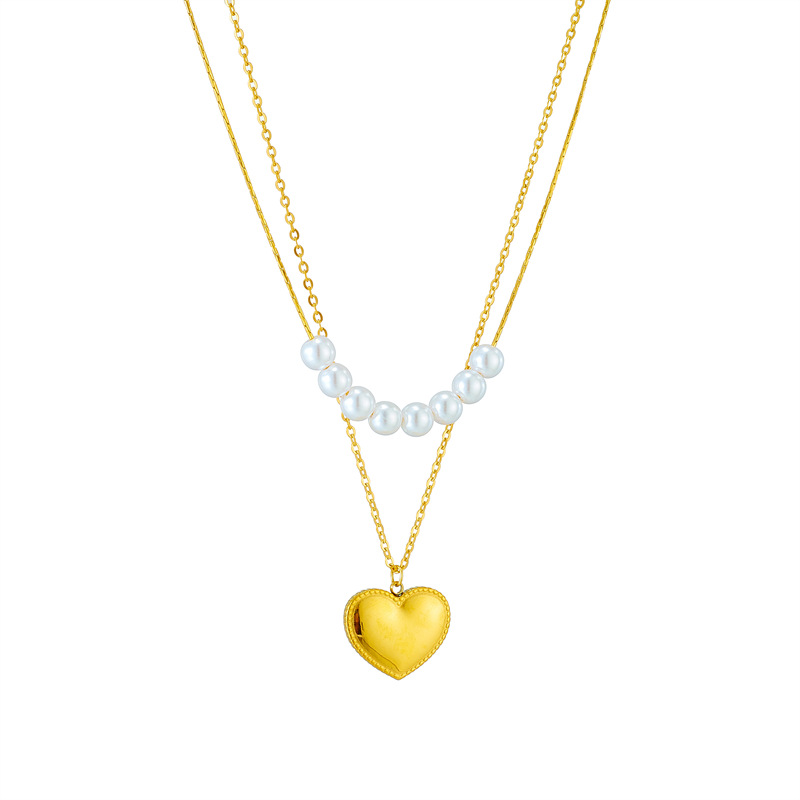 New light luxury double-layer pearl three-dimensional heart pendant necklace, elegant and simple clavicle chain