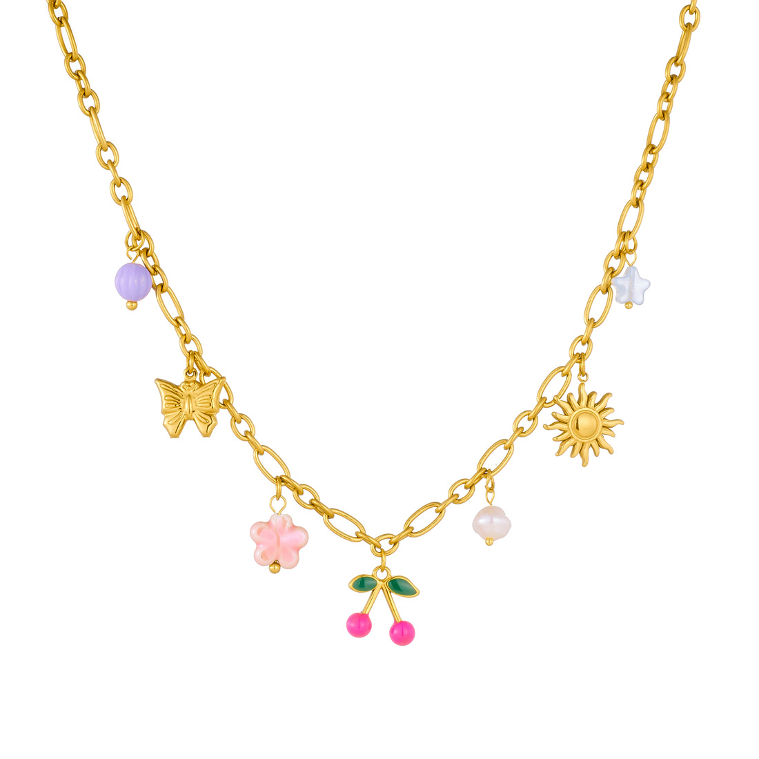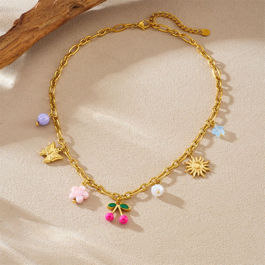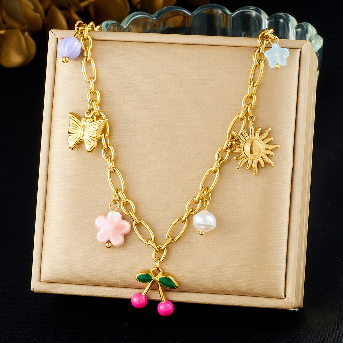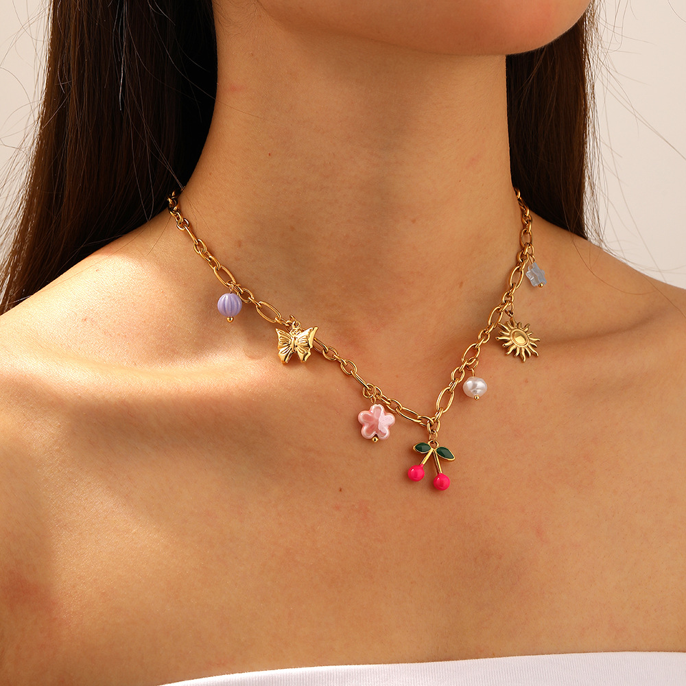 New retro pearl flower drip cherry clavicle chain, sweet and versatile gold-plated sun butterfly pendant necklace