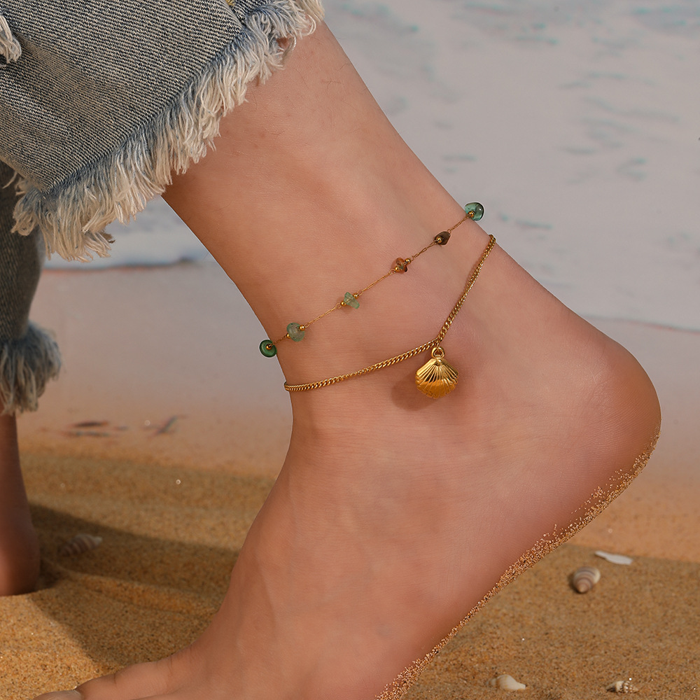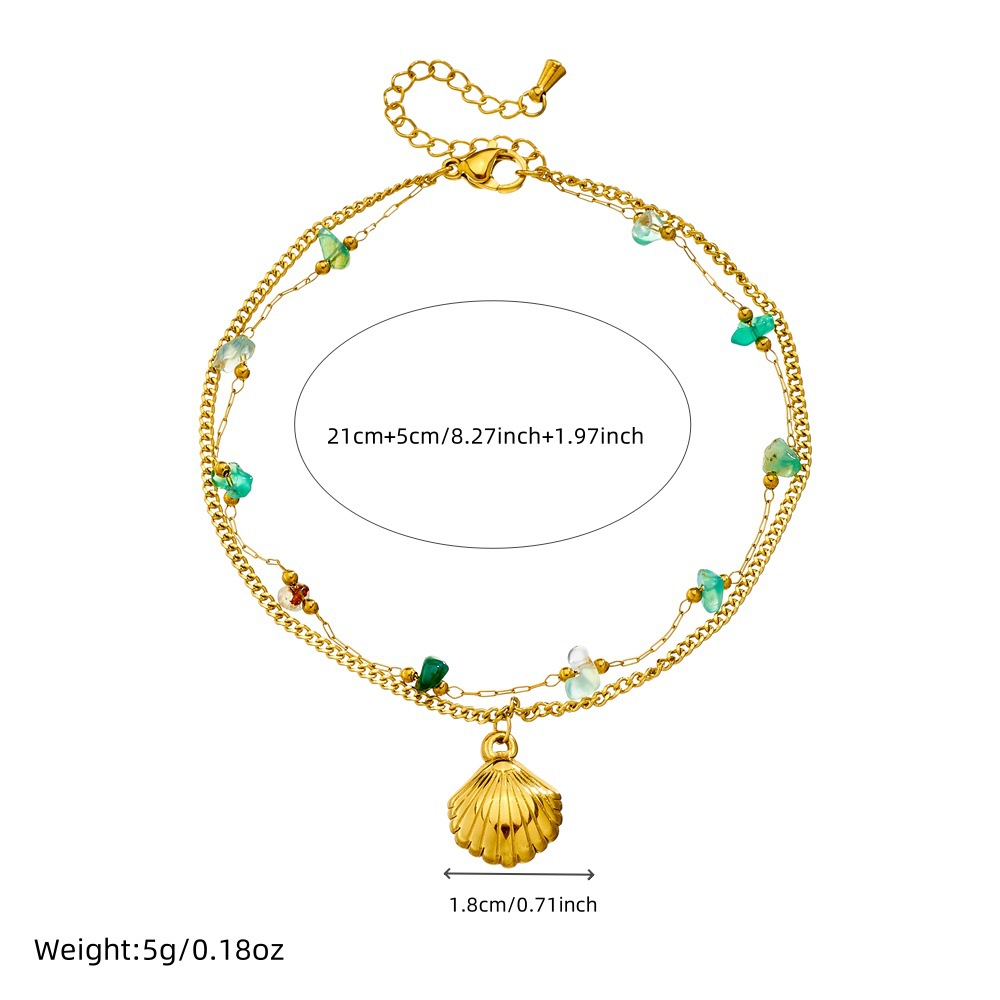 Home > New Arrival > New summer beach style green gradient pebble and seashell accessories double-layered chain stainless steel anklet