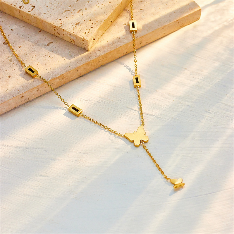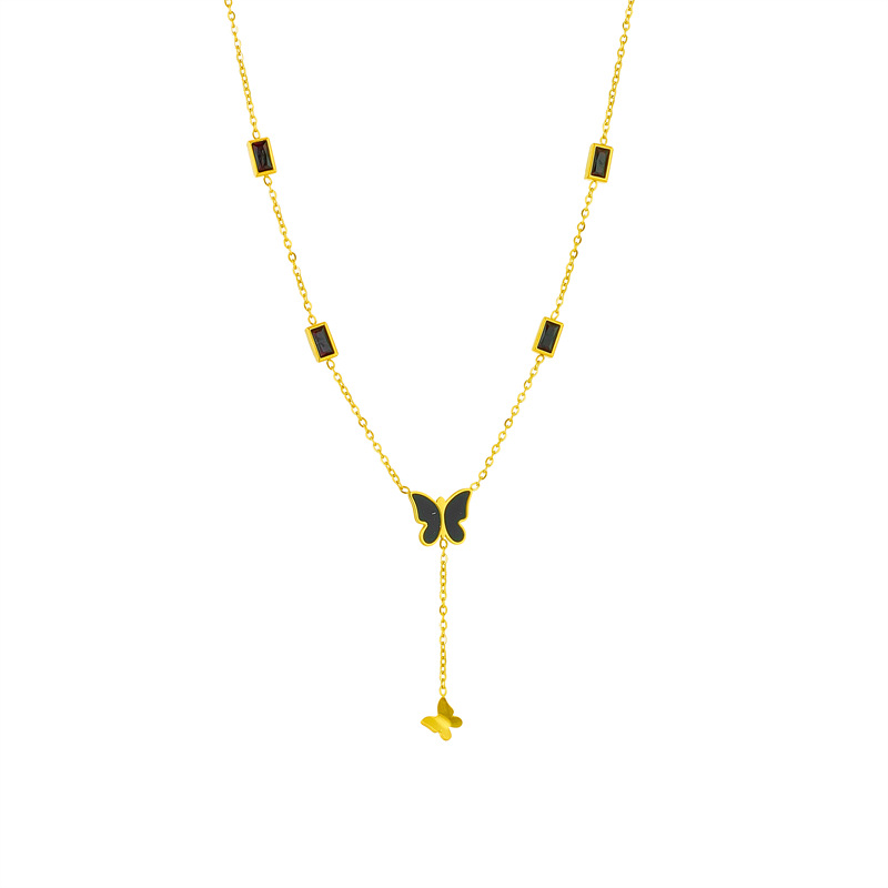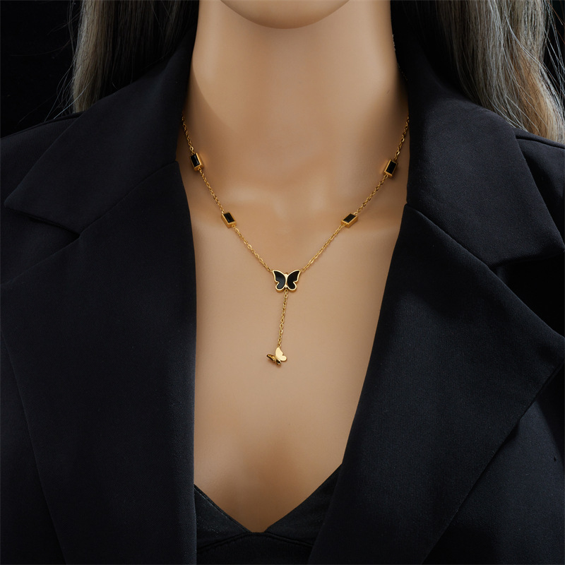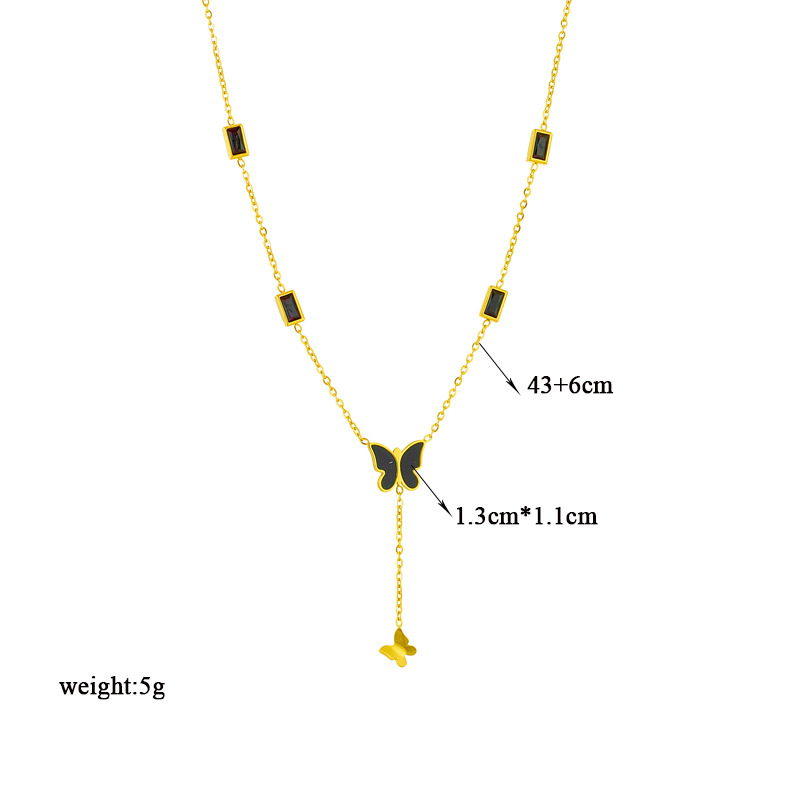 Home > New Arrival > Niche black glossy butterfly tassel pendant with black diamond square titanium steel elegant high-end jewelry necklace