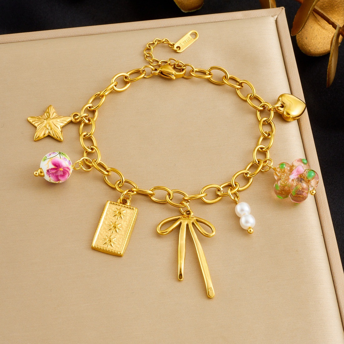 Home > New Arrival > Niche fashion, fresh and rustic style, multi-pendant gold-plated chain, bow, star, ceramic beaded pendant bracelet