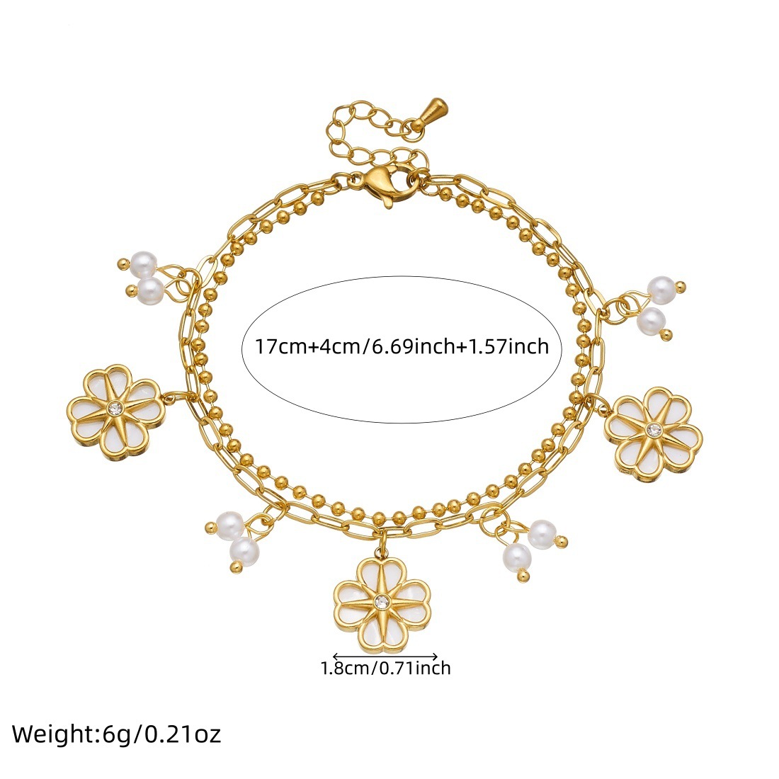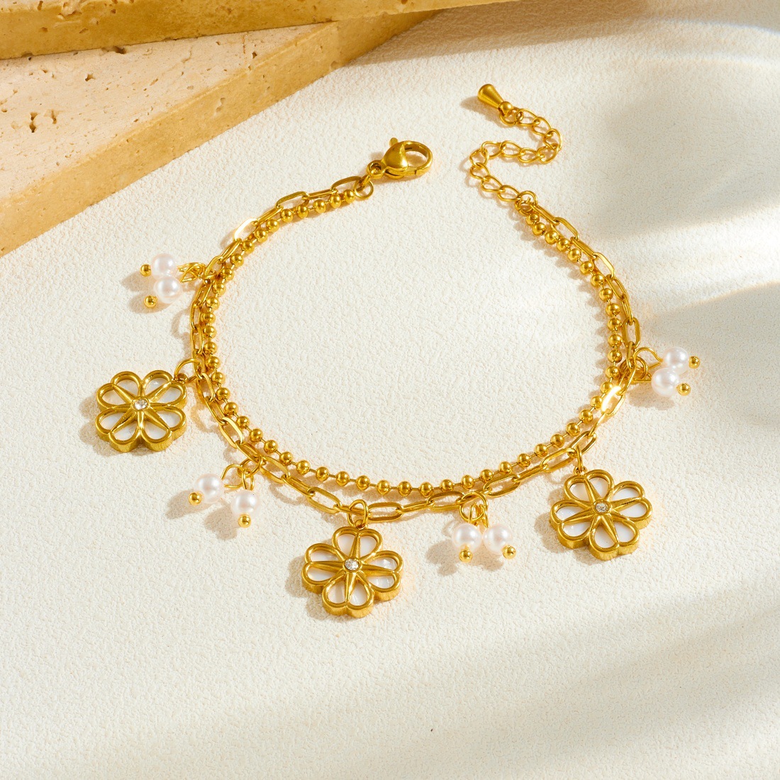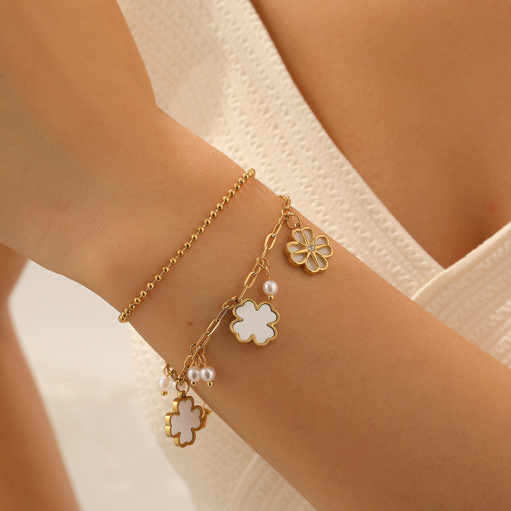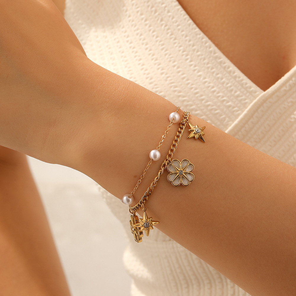 Home > New Arrival > Niche fashion, understated luxury, versatile floral pearl bracelet, gold-plated stainless steel double-layer chain, high-end feel.