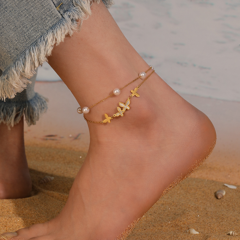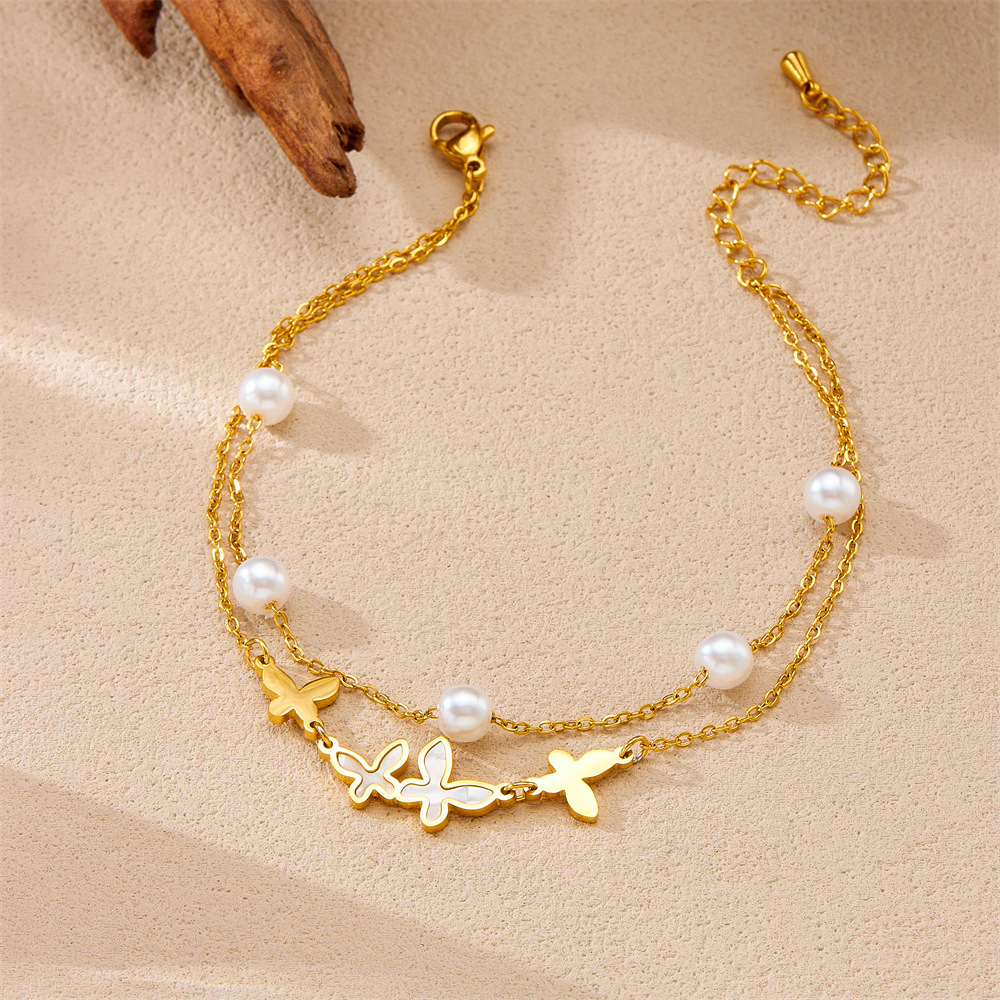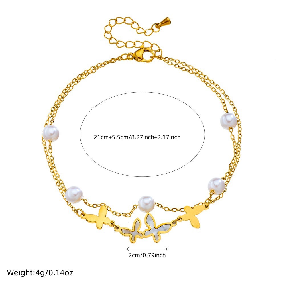 Home > New Arrival > Niche minimalist retro layered double pearl butterfly pendant stainless steel gold-plated jewelry women's anklet