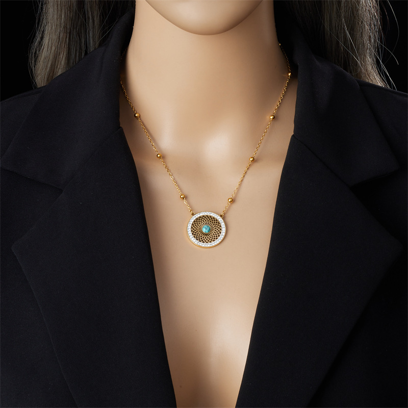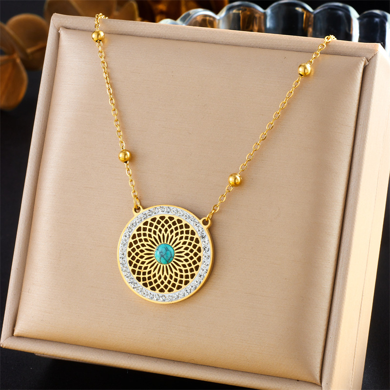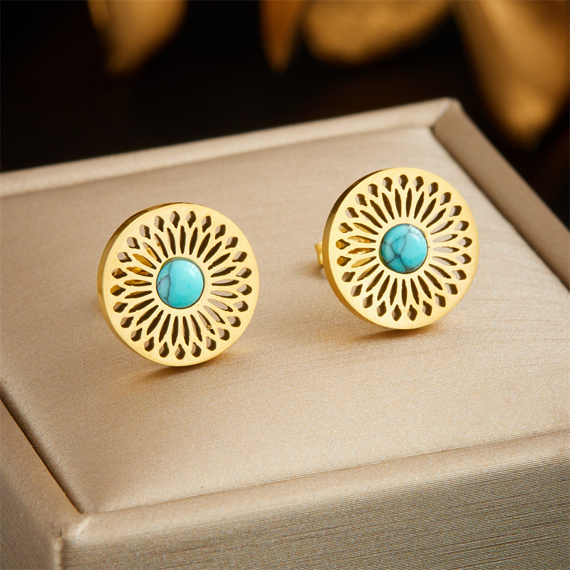 Niche style retro ethnic style hollowed-out pattern turquoise inlaid stainless steel earrings and necklace set
