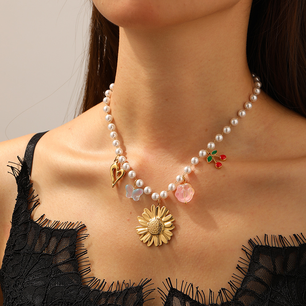 Pearl chain gold-plated cherry fruit pendant heart sunflower flower accessory necklace