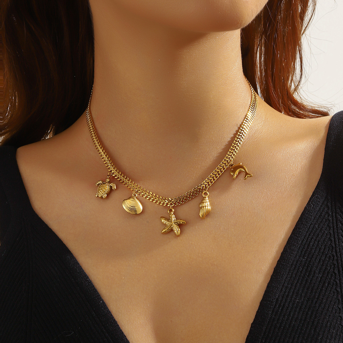 Personalized creative beach style ocean series pendant chain stainless steel gold-plated starfish and sea turtle necklace
