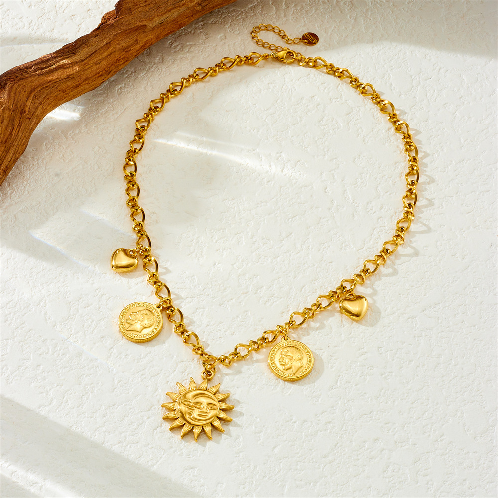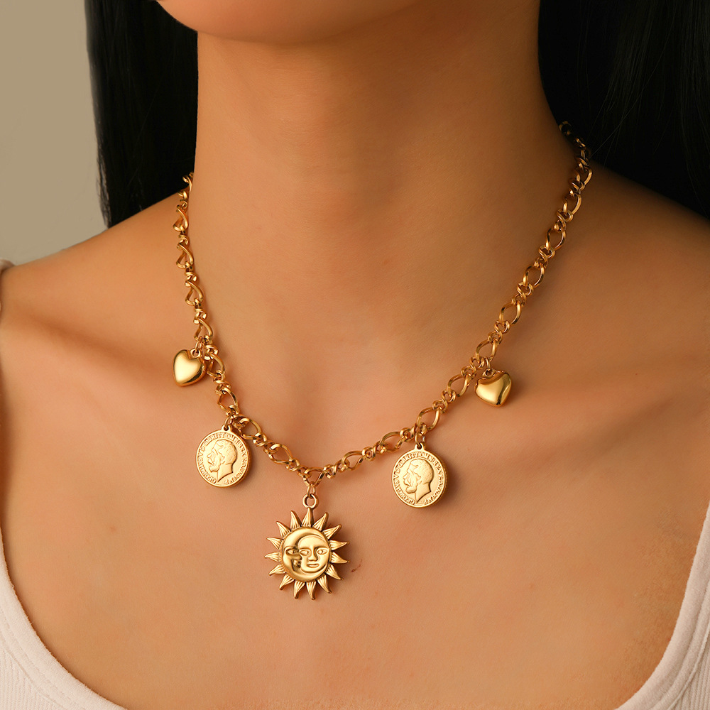 Home > New Arrival > Personalized punk sun face round coin heart pendant chain stainless steel chunky necklace