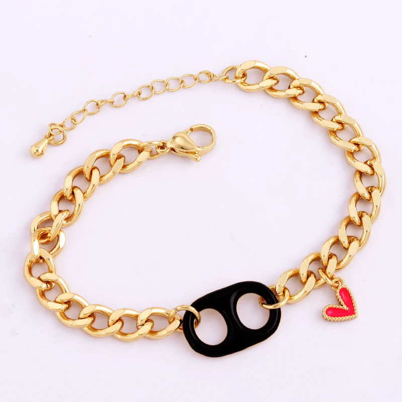 Home > Fashion Jewelry > Pig Nose Soda Cap Twin Hole Trendy Colourful Romance Love Heart Enamel Charm Bracelet, Cuban Figaro Chain 18K Gold Plated Bangle