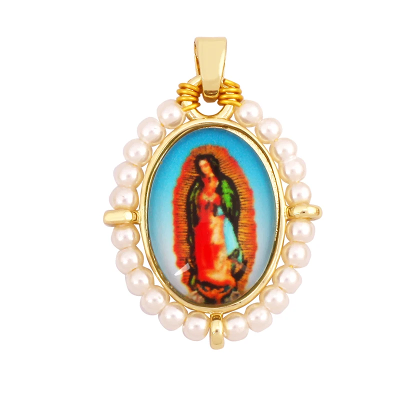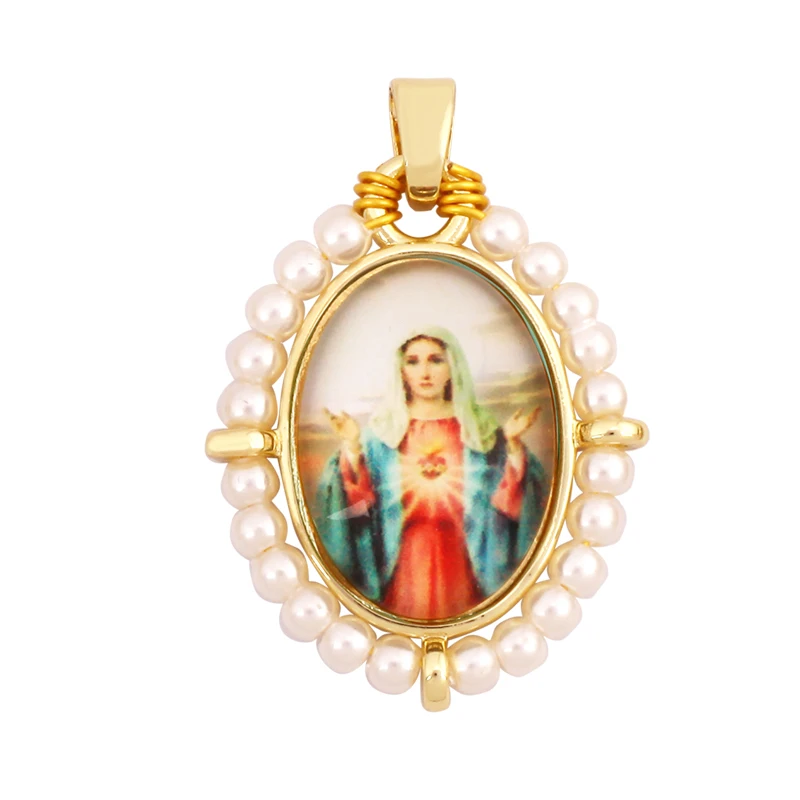 Religious Style Holy Jesus Virgin Mary Charm Geometry Pendant,18K Gold Inlaid Cubic Zirconia Pearl Jewelry Necklace Supplies K61