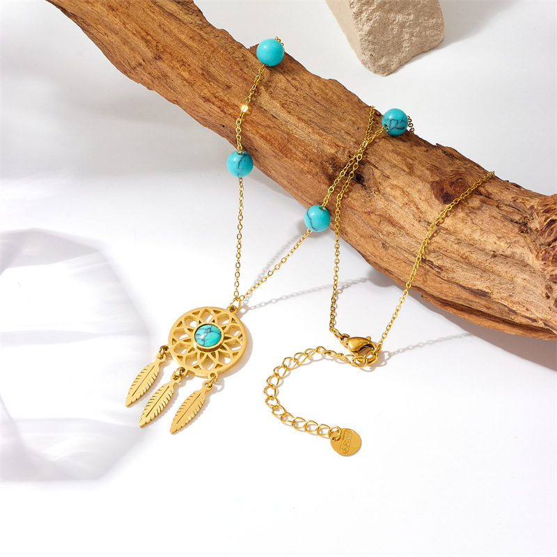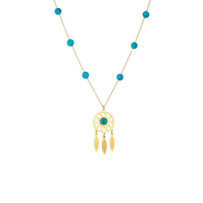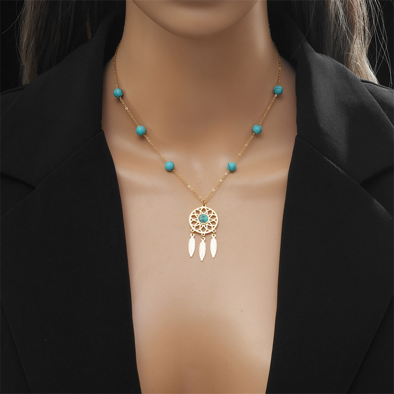 Home > New Arrival > Retro ethnic style, turquoise beaded dreamcatcher pendant chain, titanium steel necklace