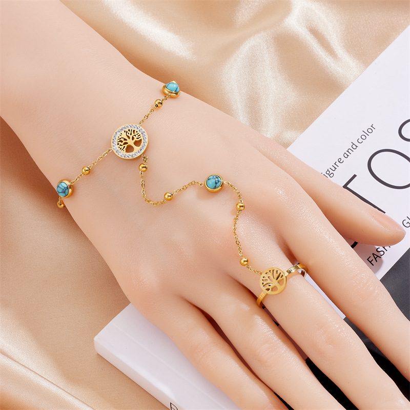 Retro high-end chain gold-plated stainless steel Tree of Life blue turquoise accessories open ring bracelet