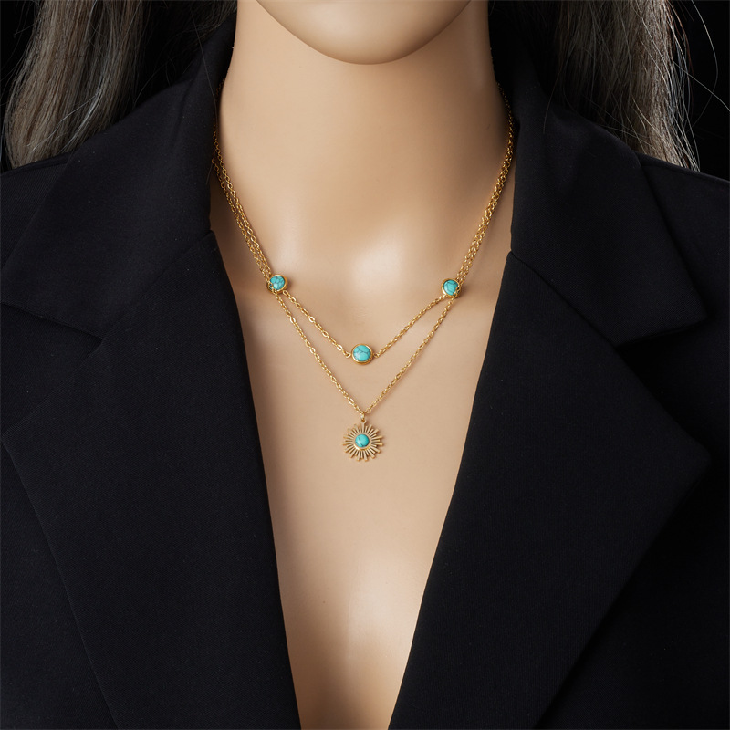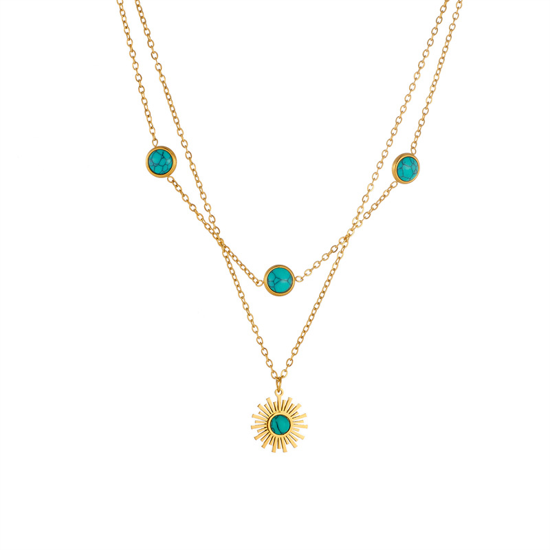 Retro-inspired stainless steel double-layer necklace with turquoise sun pendant chain.