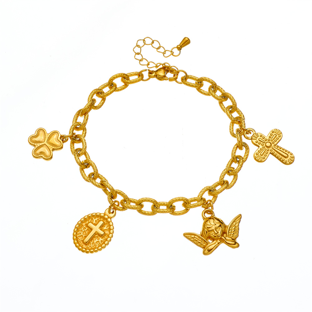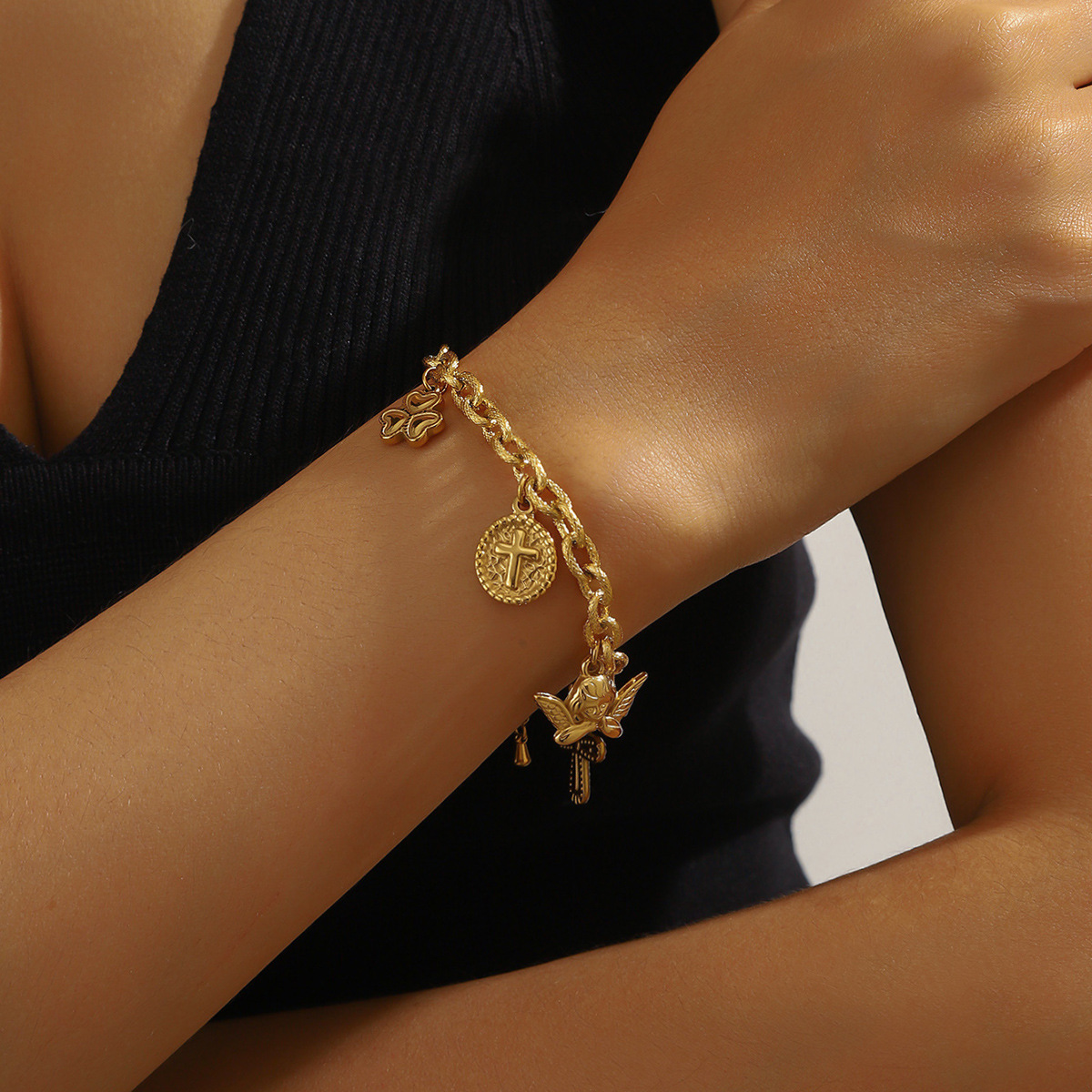 Retro light luxury chunky chain gold-plated stainless steel oval cross angel pendant trendy bracelet for women