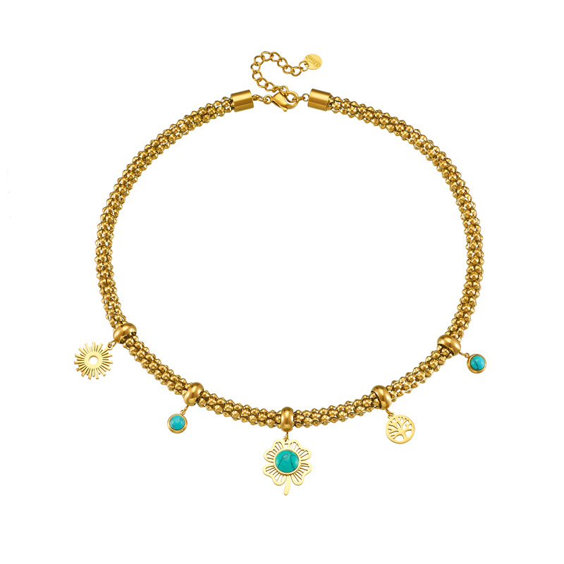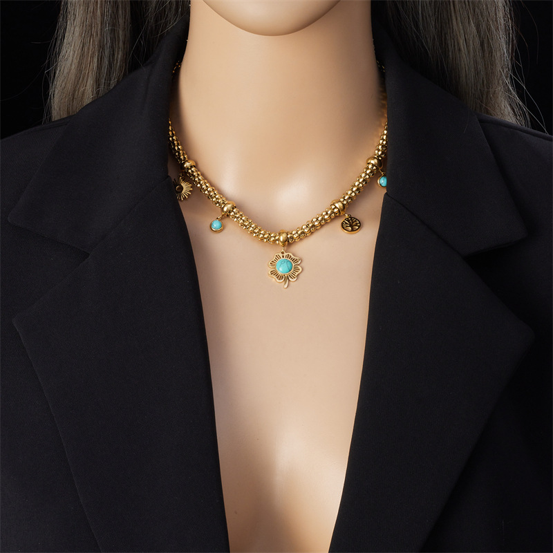 Retro metal inlaid blue turquoise four-leaf clover tree of life pendant stainless steel chain necklace