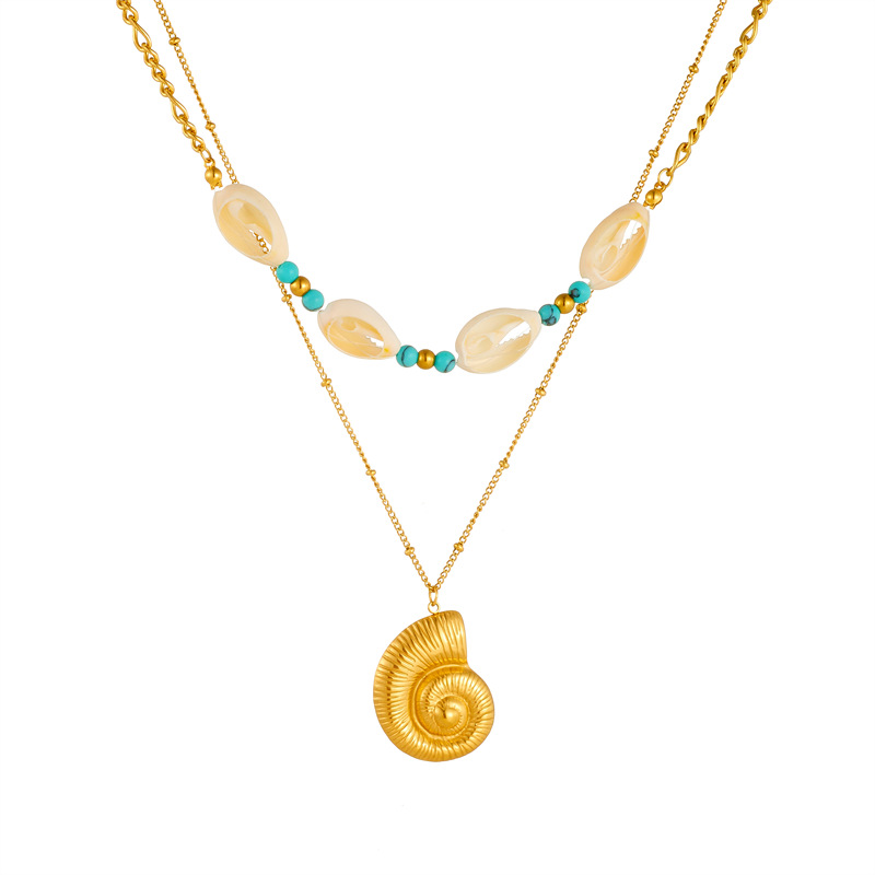 Home > New Arrival > Retro trendy turquoise, conch, and seashell accessories, double-layer chain, stackable stainless steel necklace