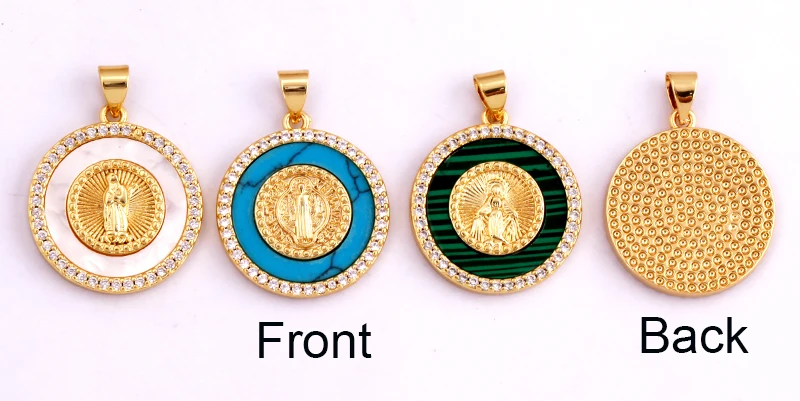 Round Shape Miraculous Medal Virgin Mary Catholic,Holy Natural Mother of Pearl Shell Agate Malachite Tiger Eye Pendant Charm M66