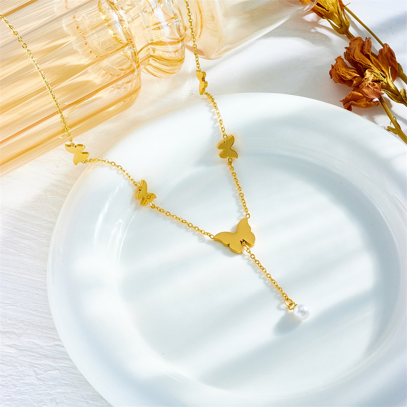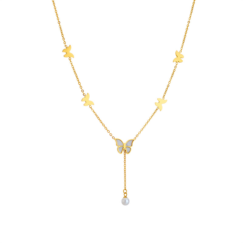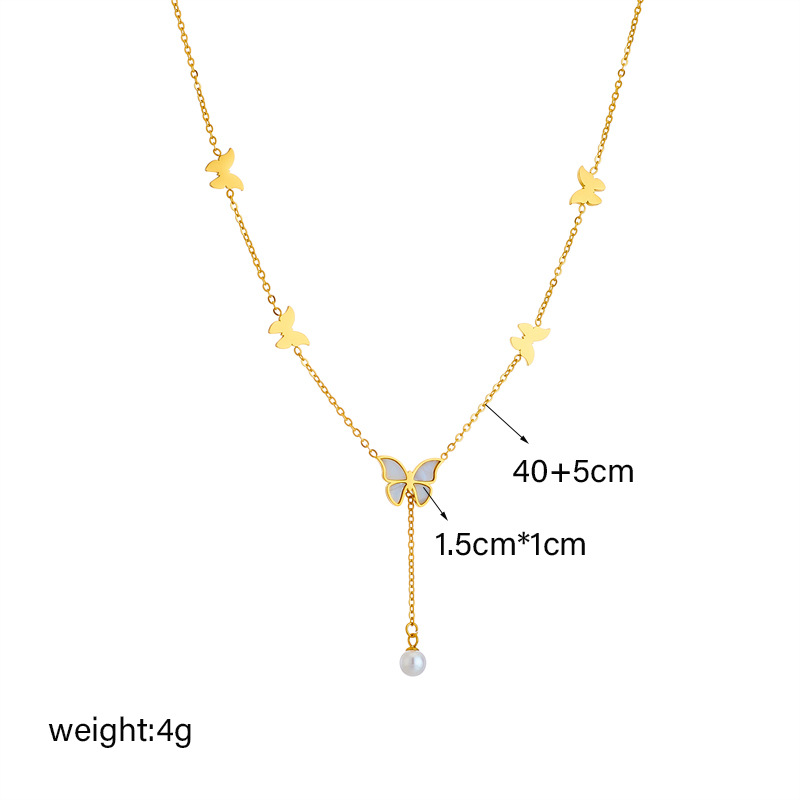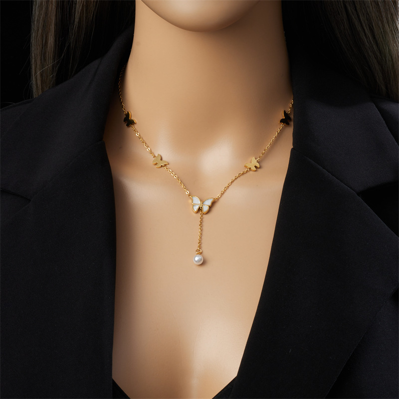 Home > New Arrival > Simple, light luxury, elegant titanium steel metal chain tassel pearl butterfly pendant necklace.