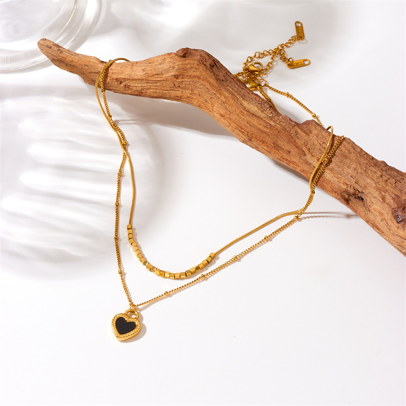 Home > New Arrival > Simple and versatile, heart-shaped gold-plated titanium steel double-layer chain necklace with black and white heart pendant.