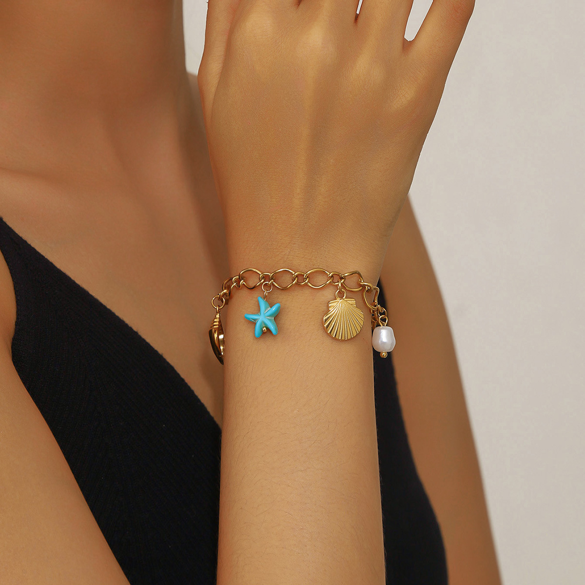 Home > New Arrival > Stainless steel pearl personalized ocean series seashell starfish pendant versatile 18K gold plated bracelet