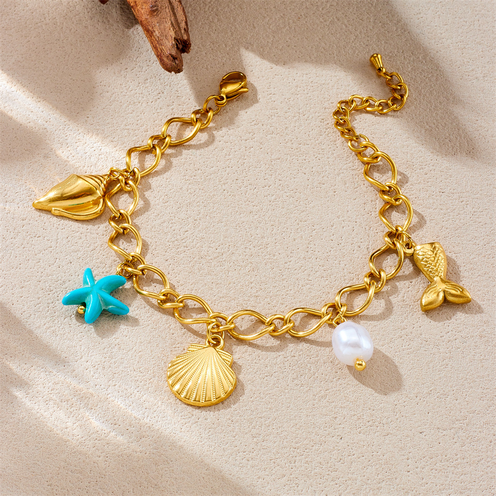 Stainless steel pearl personalized ocean series seashell starfish pendant versatile 18K gold plated bracelet