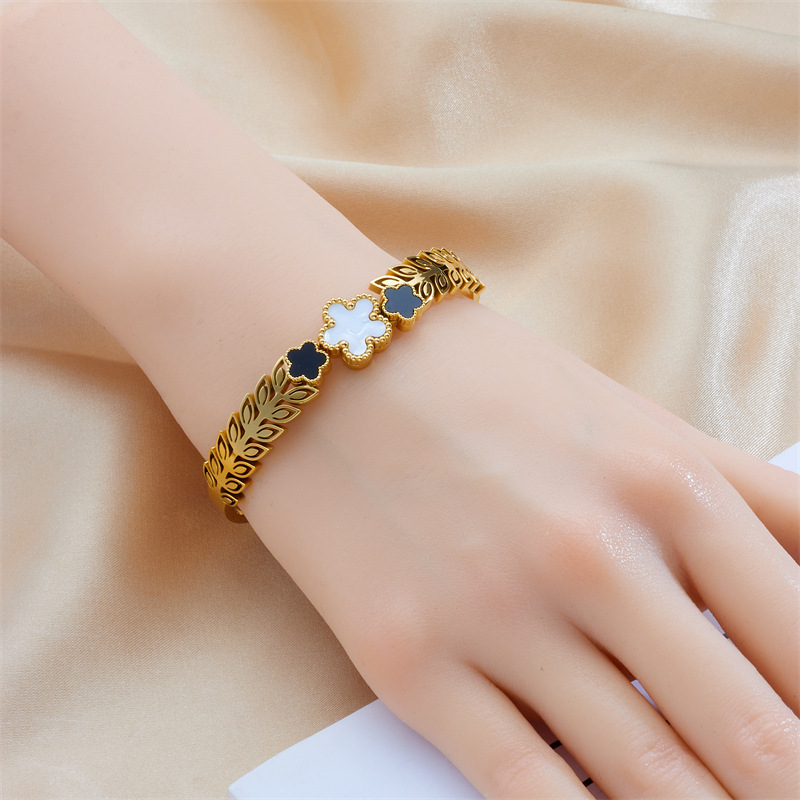 Stylish, retro-chic, minimalist black and white five-petal flower wheat ear gold-plated stainless steel jewelry bracelet