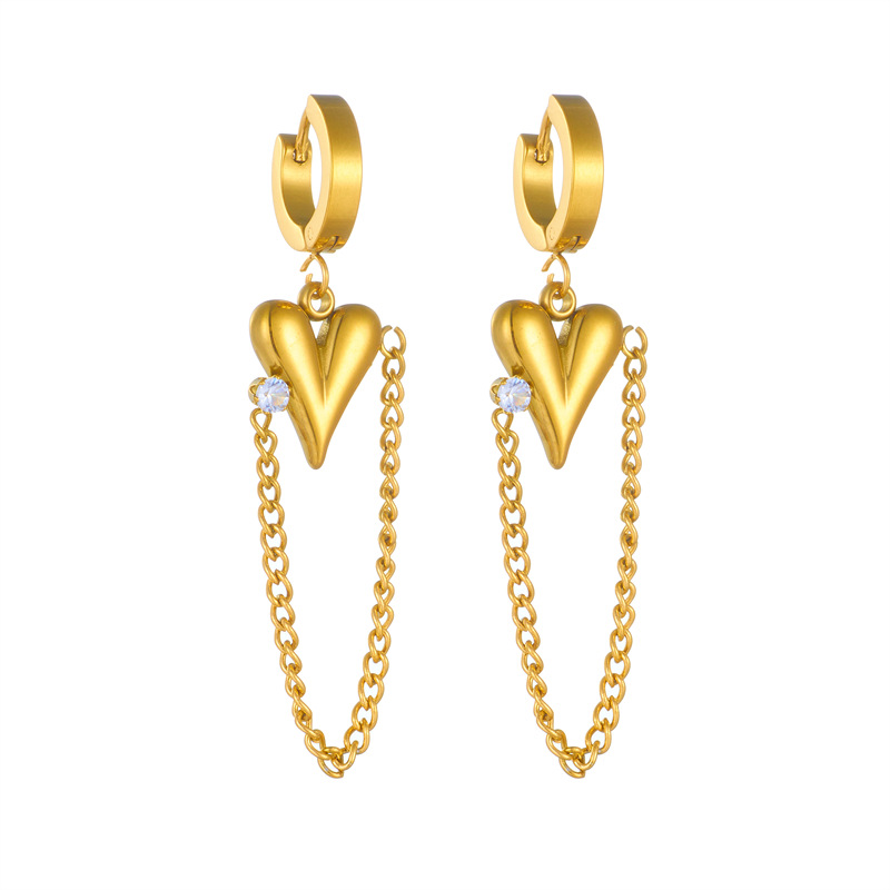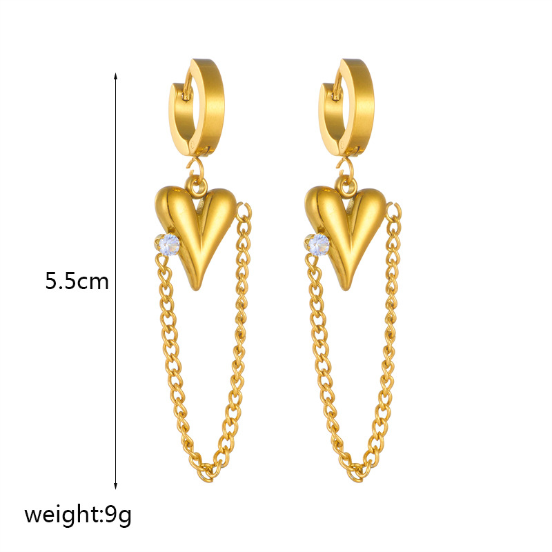 Stylish, sophisticated, and luxurious long chain earrings with diamond-encrusted heart pendant, gold-plated titanium steel.