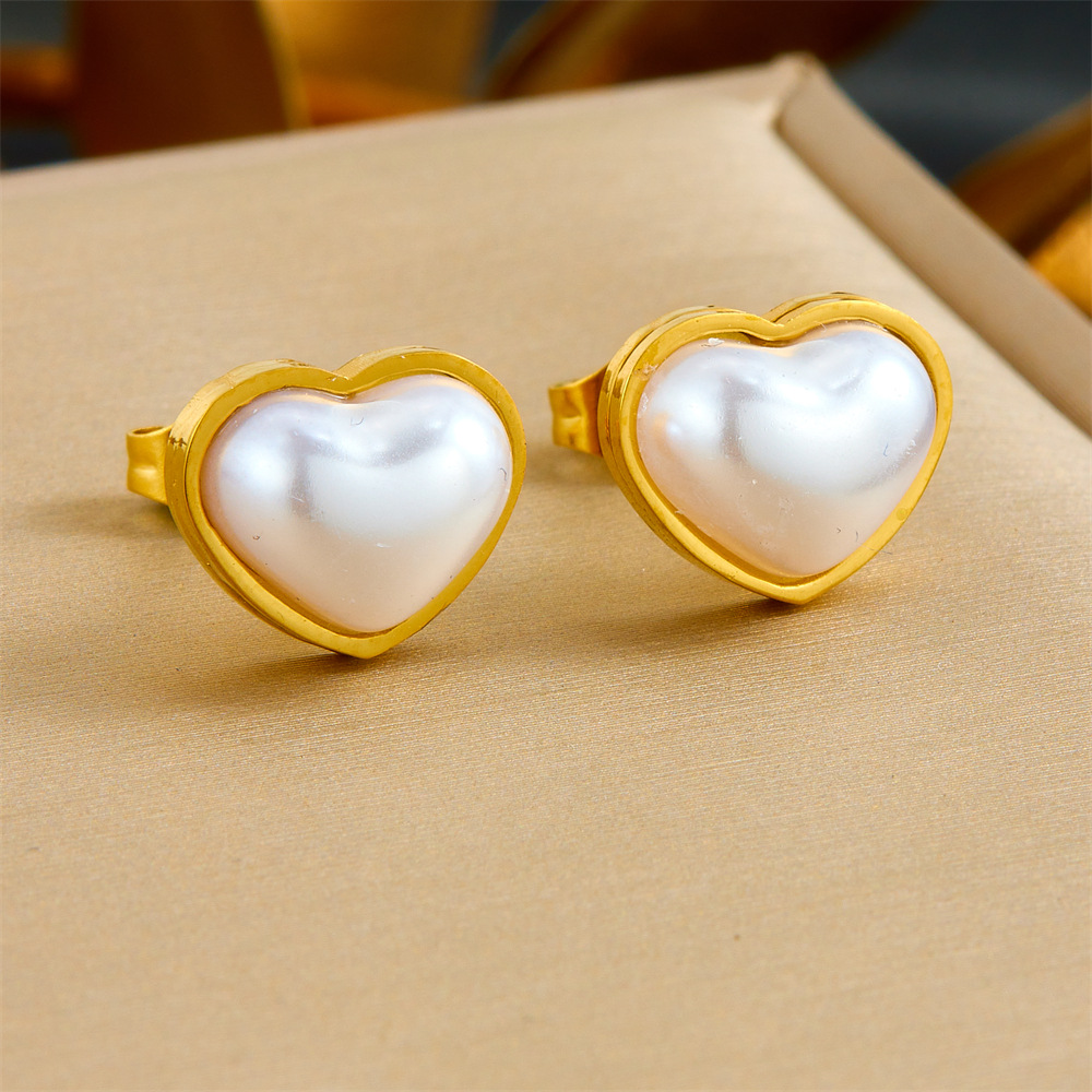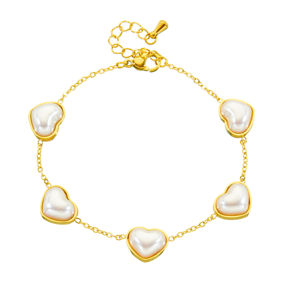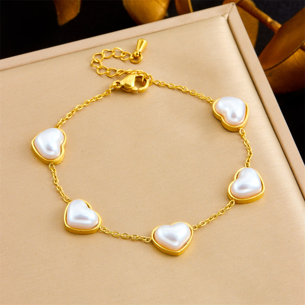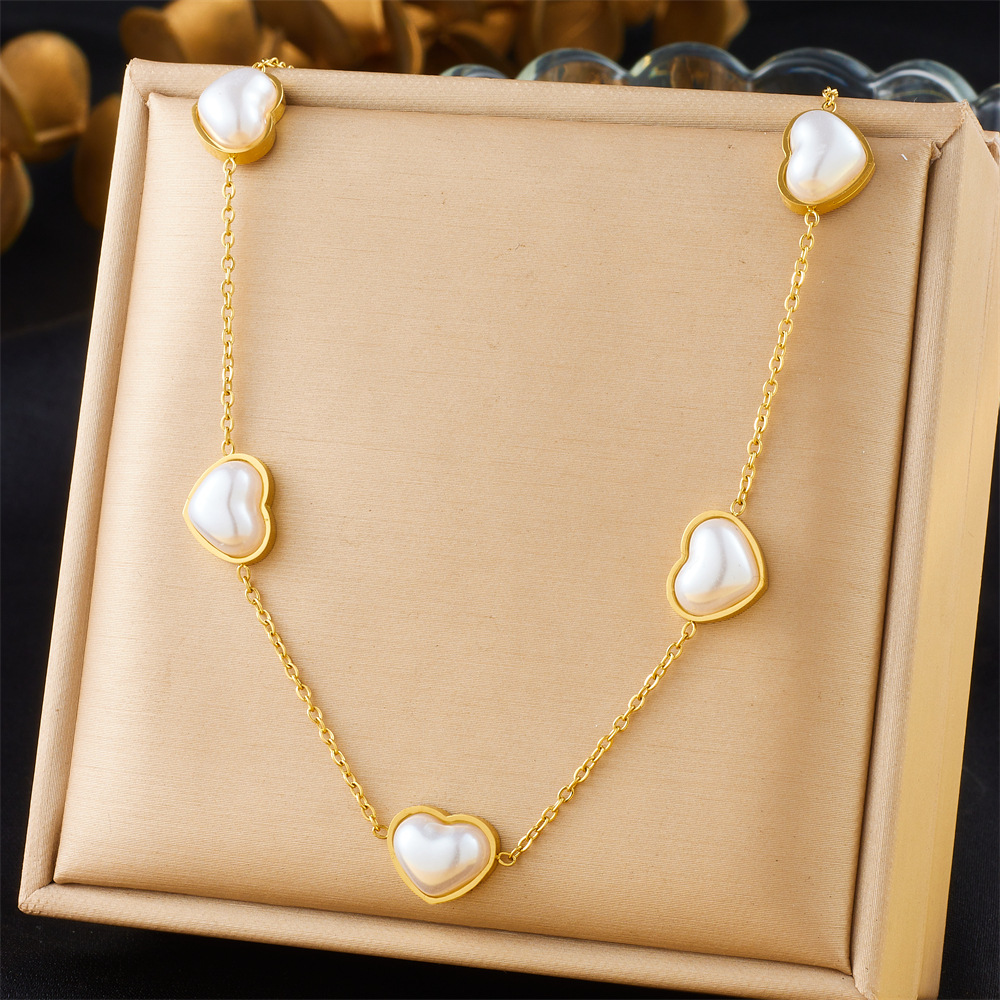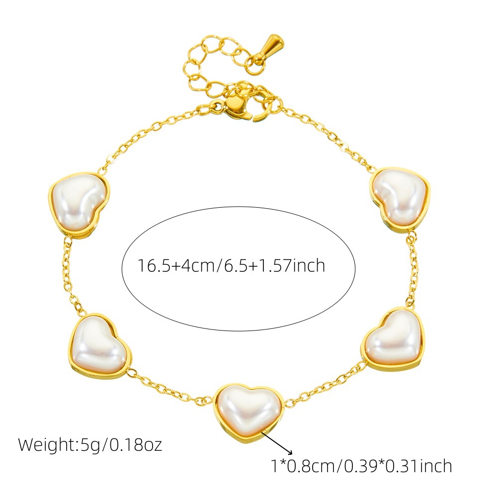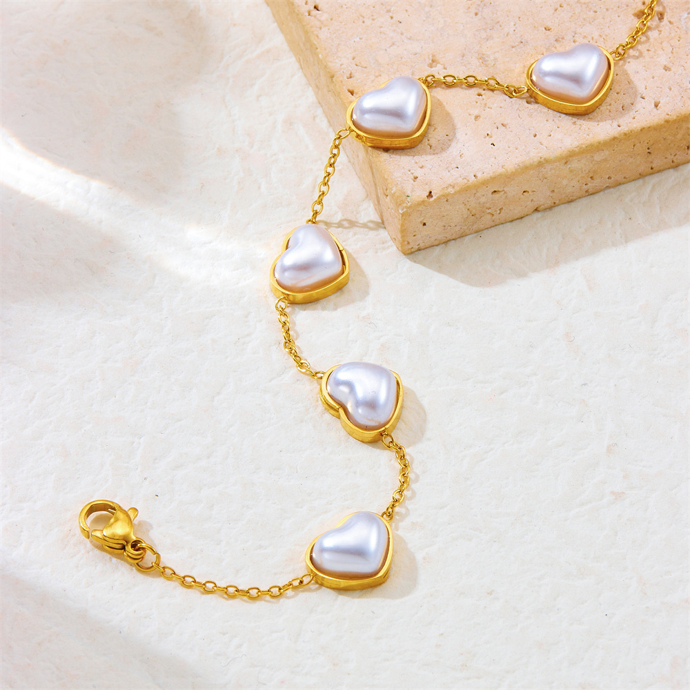 Stylish and minimalist French retro pearl heart gold-plated stainless steel O-chain bracelet, earrings, and necklace set.