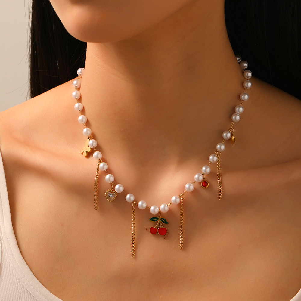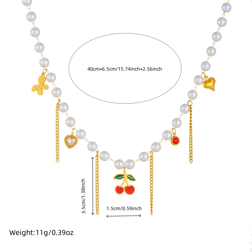 Sweet and elegant pearl chain tassel drip cherry heart butterfly pendant necklace