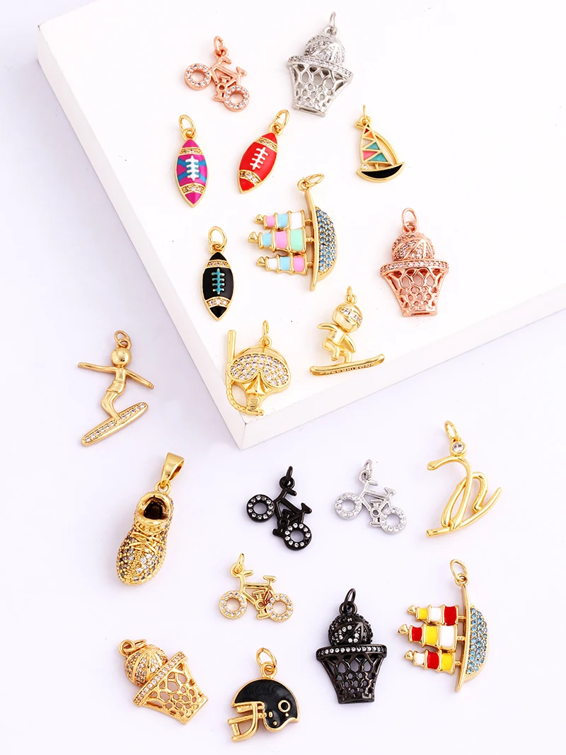 Trendy Sports Sneakers Skis Surfboard Bike Cubic Zirconia CZ Paved Charm Pendant, 18K Gold Necklace Craft Jewelry Supplies M26