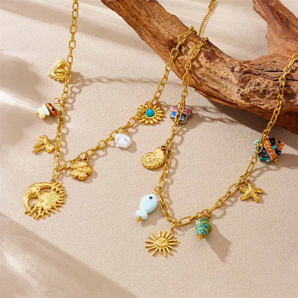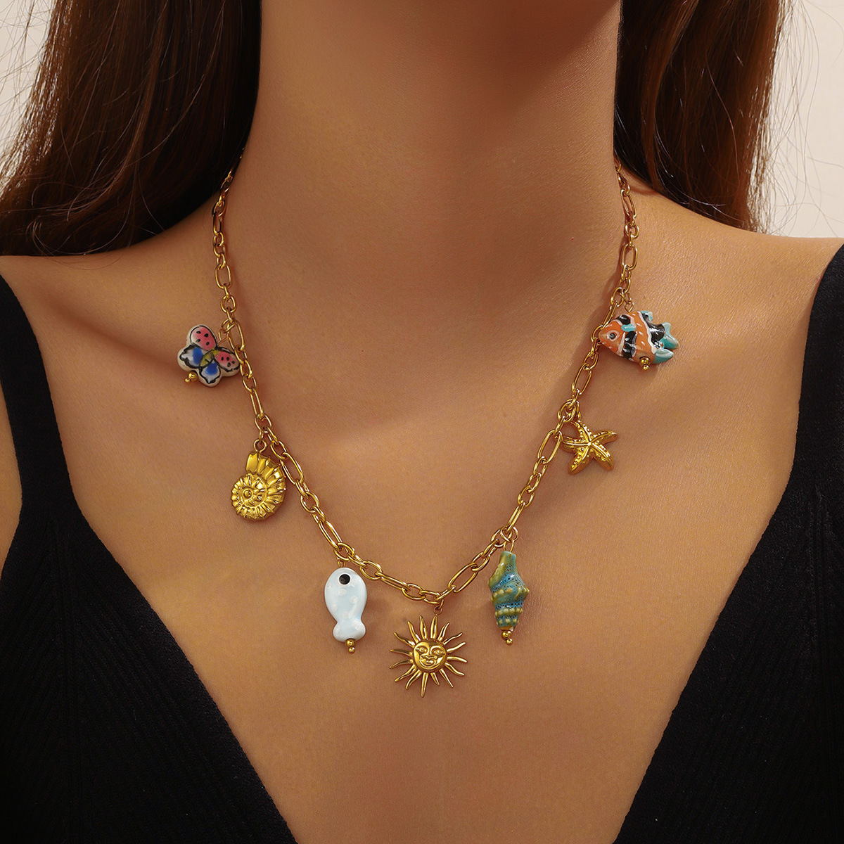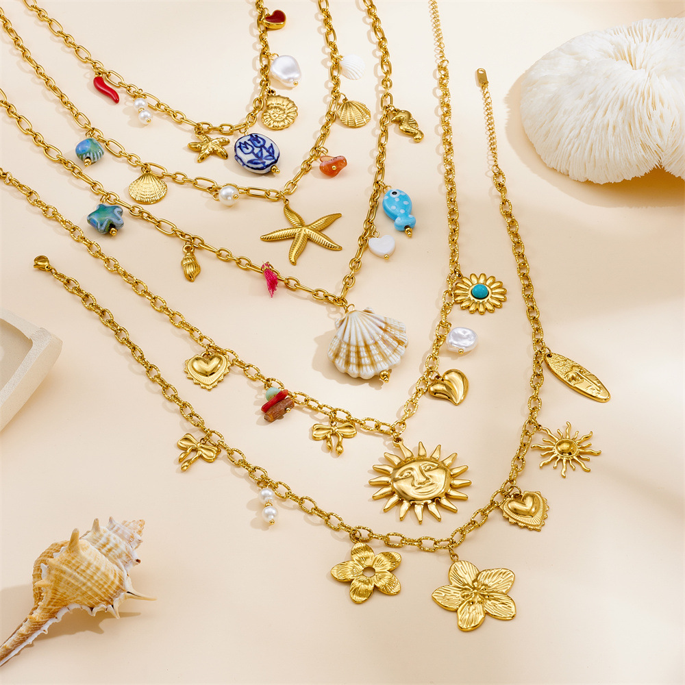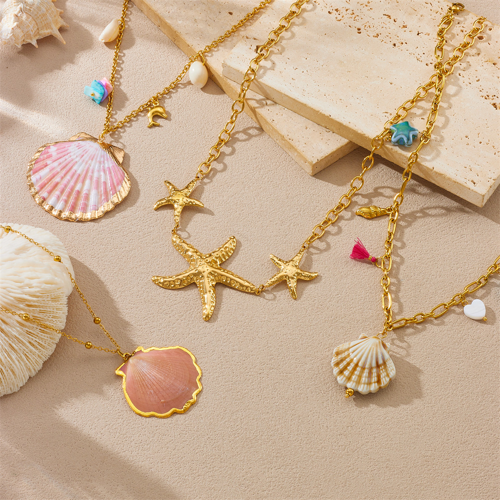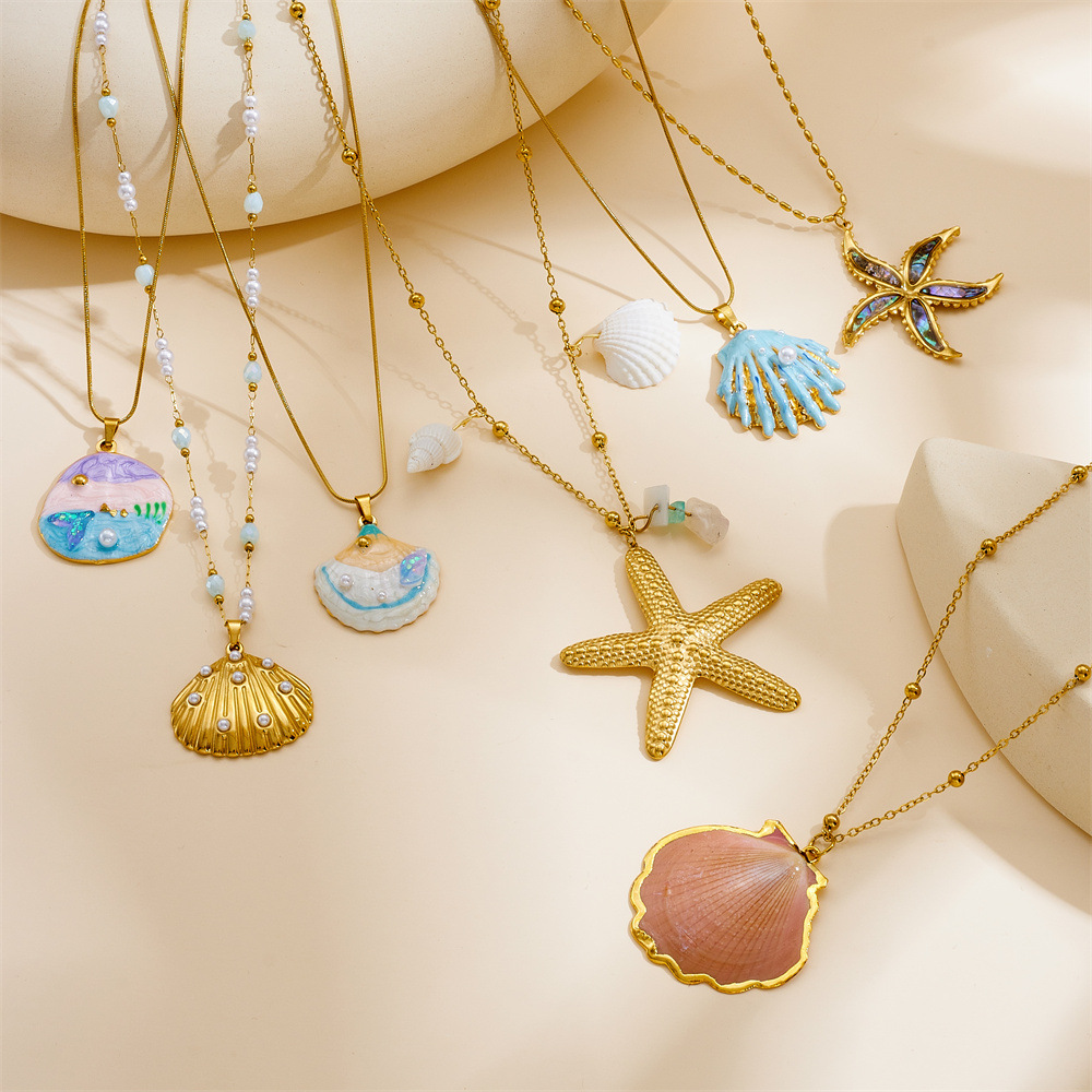 Home > New Arrival > Vacation high-end multi-element marine life pendant seashell starfish sun stainless steel necklace